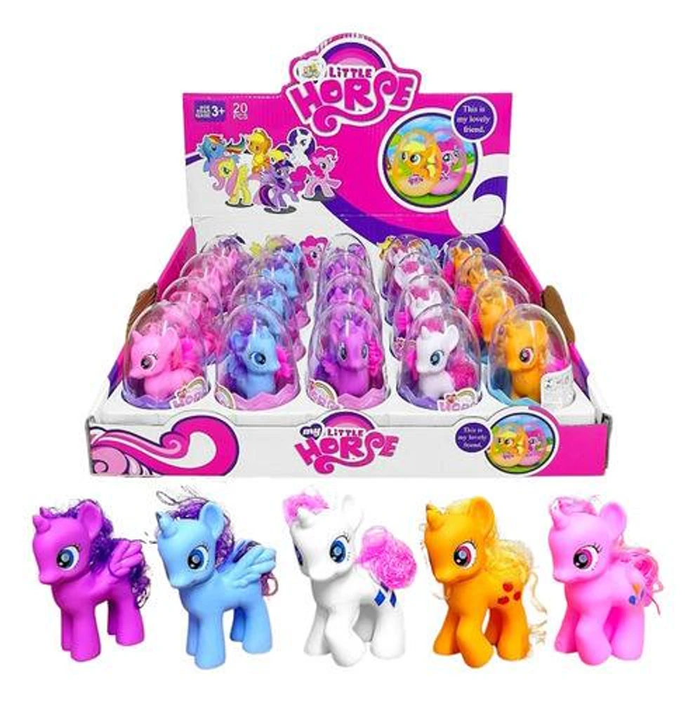 Cada uma delas escondida em um "ovo" temático da linha My Little Horse. Cada unicórnio do kit acompanha um pequeno pente, permitindo que as crianças cuidem e estilize as crinas mágicas de seus novos companheiros. Este conjunto colecionável proporciona uma experiência divertida de desembalar e descobrir cada um dos unicórnios ao mesmo tempo, em que incentiva a criatividade e o brincar de faz de conta.