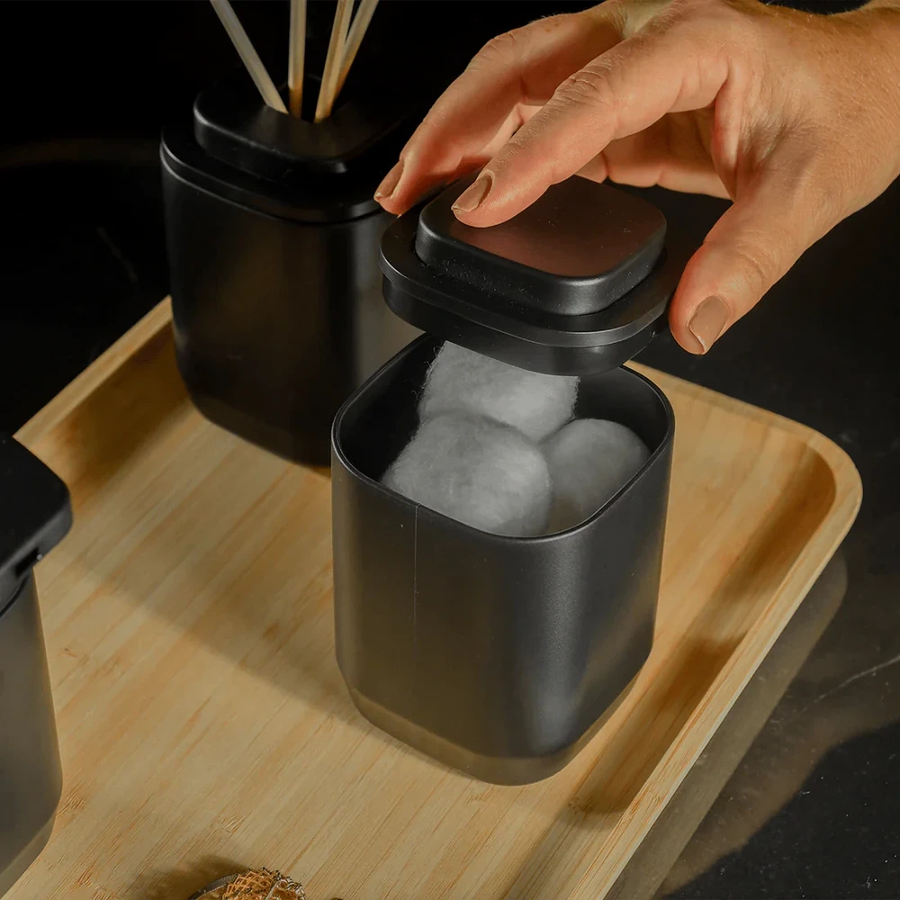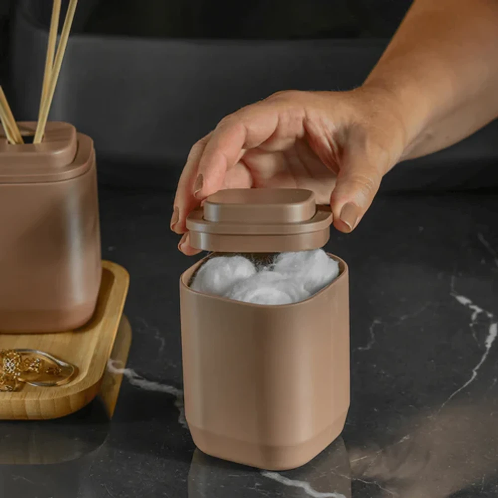 Fabricado em material resistente, o porta-algodão conta com tampa que protege o conteúdo contra poeira e umidade, garantindo higiene e conservação. Seu formato compacto é perfeito para otimizar o espaço sobre bancadas e prateleiras, sem abrir mão do estilo.