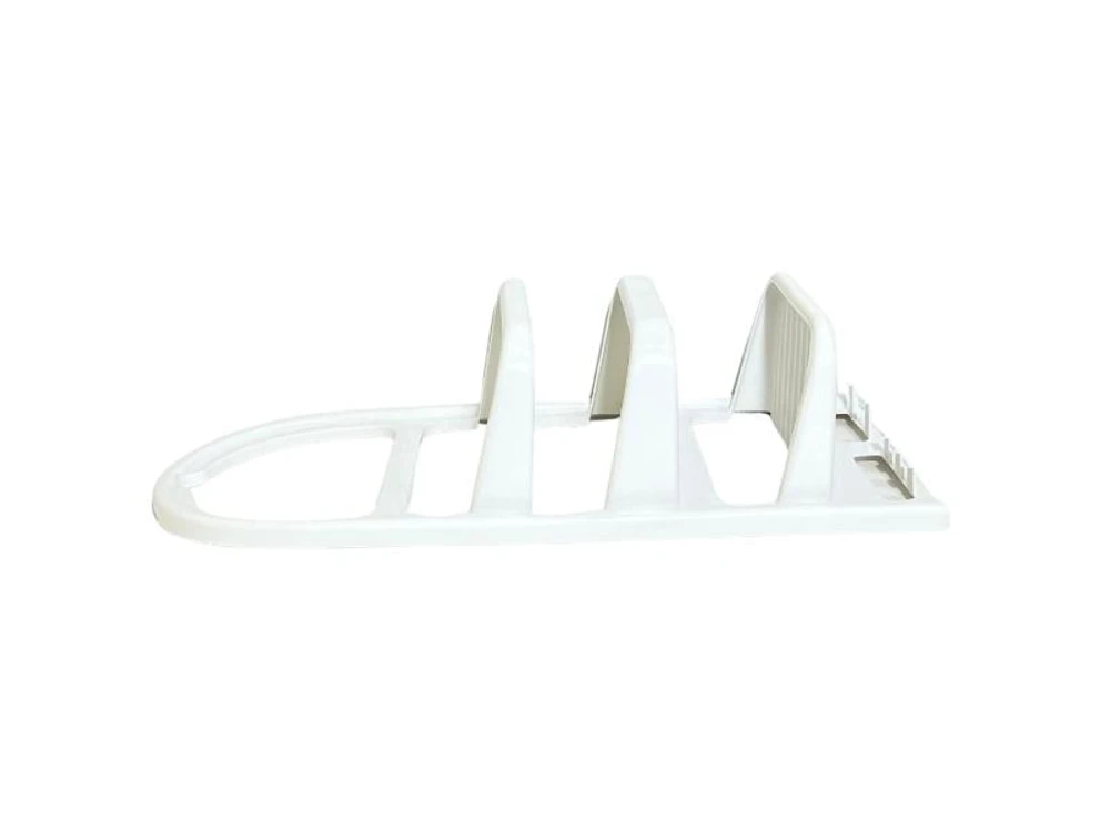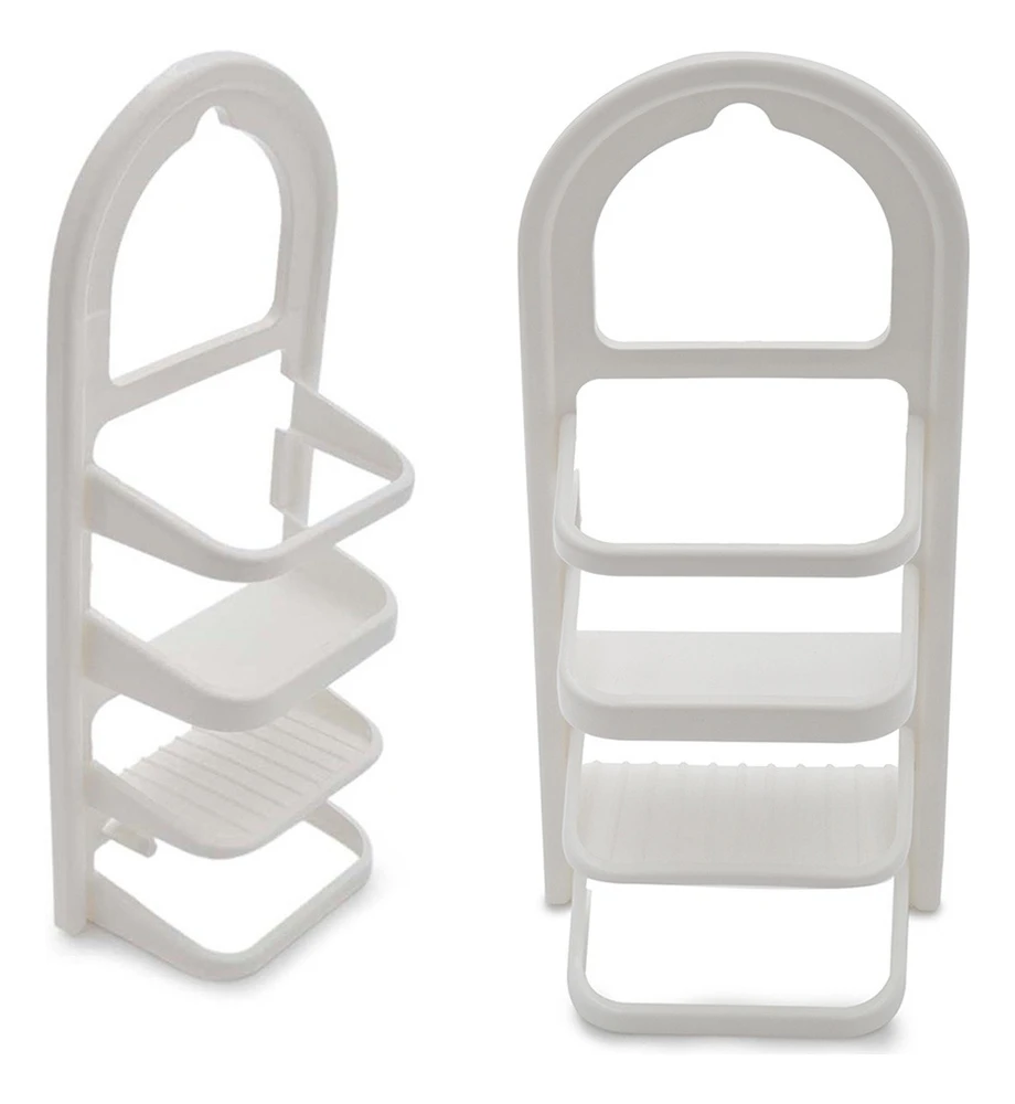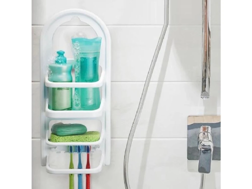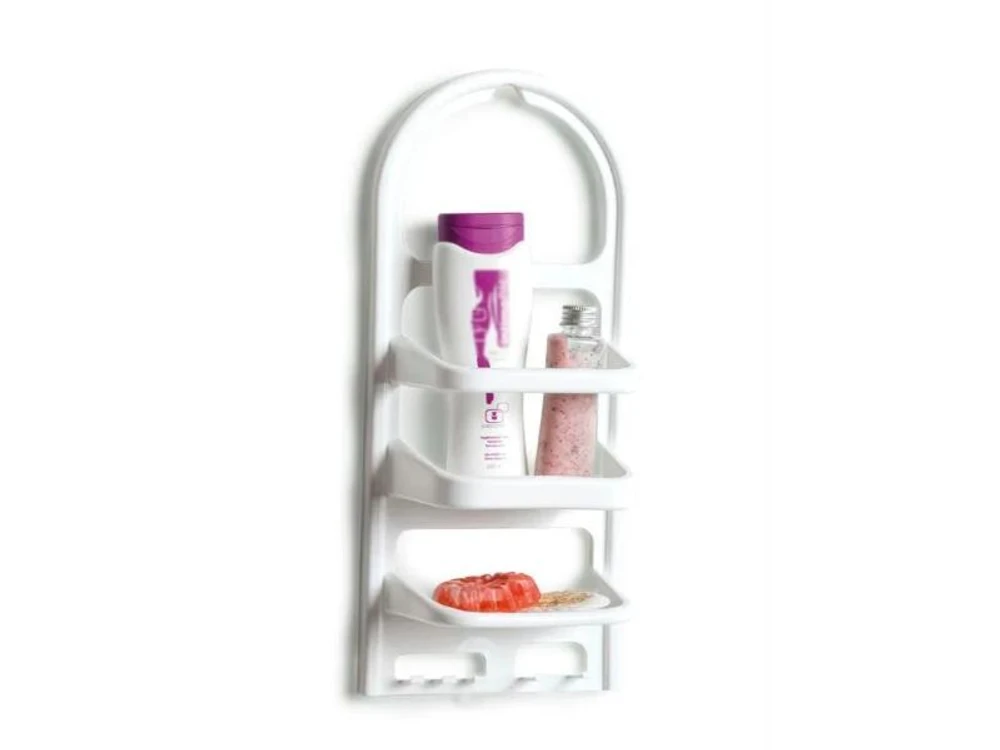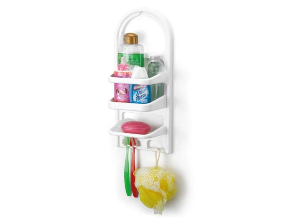 Porta Shampoo plástico com uma saboneteira, mais um compartimento para organizar produtos de higiene pessoal ou limpeza, além de ganchos para apoiar a lâmina de barbear ou pendurar pequenos objetos.