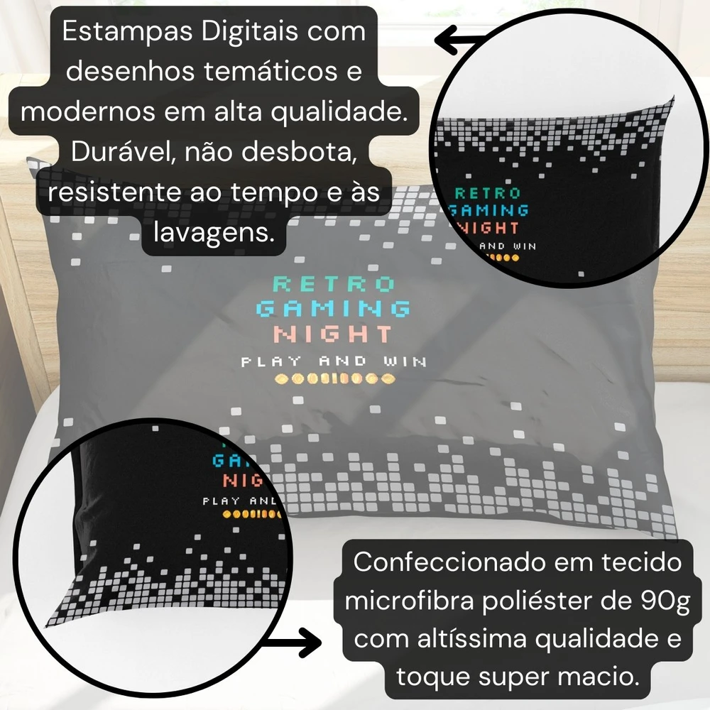 Apresentamos o Porta Travesseiro Retro Game, uma escolha perfeita para os entusiastas de jogos e cultura geek. Com uma estampa digital nostálgica inspirada nos clássicos jogos retrô, esta fronha adiciona um toque de diversão e personalidade ao quarto juvenil ou infantil. Com dimensões de 70cm x 50cm, é compatível com travesseiros padrão e é confeccionada com materiais de alta qualidade para garantir conforto e durabilidade. Transforme o espaço de dormir do seu jovem com esta fronha que celebra a paixão pelos games de uma forma criativa e estilosa. Confira!