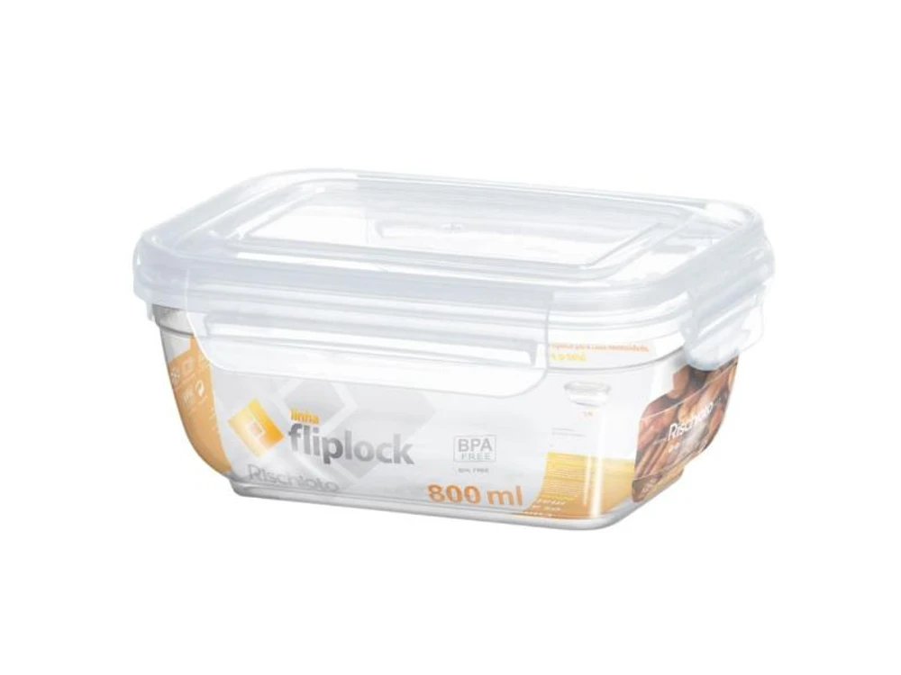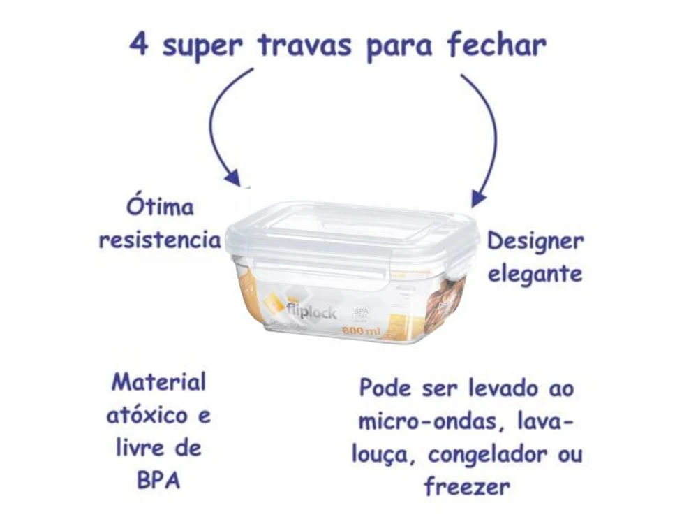 Pote retangular com travas nos 4 lados. Além de versátil, possui ótima resistência e um design elegante. Confeccionado em material atóxico e livre de BPA (produto é livre de bisfenol A). Pode ser levado ao micro-ondas, lava-louças, congelador ou freezer. Existe um Fliplock para cada necessidade. Escolha o seu!POTE RETANGULAR FLIPLOCK 800 MLReferência: 0501Medidas: 16,5 x 12 x 7,5 cm