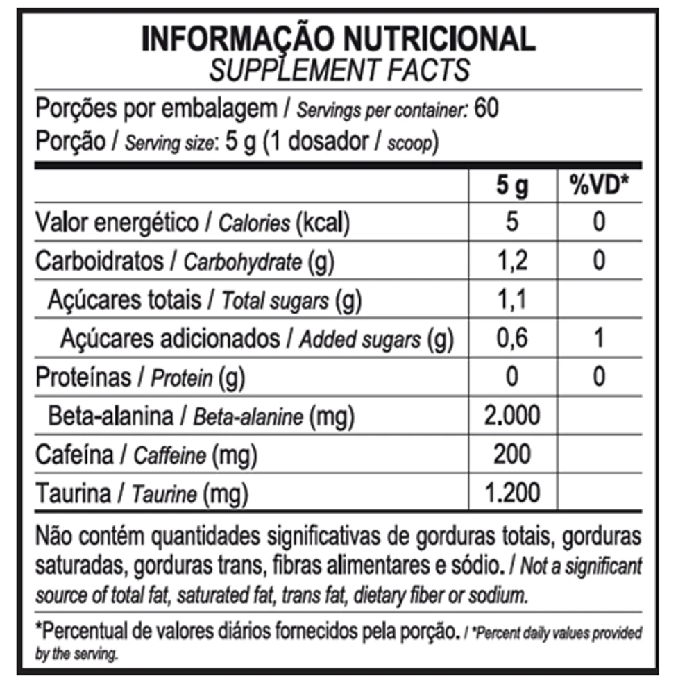 Beta-alanina, taurina, isomaltulose, cafeína, aromatizantes, acidulante ácido cítrico, regulador de acidez ácido málico, edulcorante sucralose, antiumectante estearato de magnésio e corantes artificiais amaranto e azul brilhante fcf.