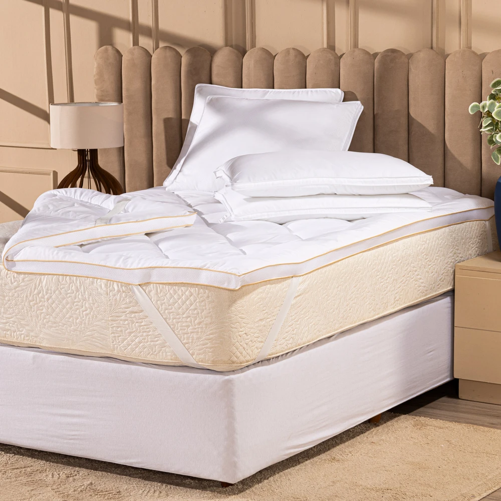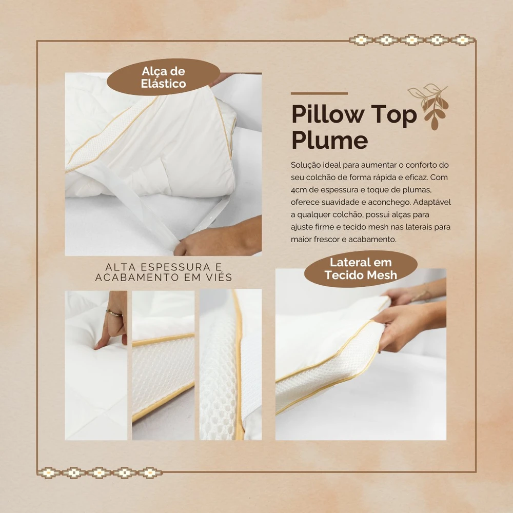 Apresentamos o Pillow Top Plume, a solução ideal para quem busca aumentar o conforto do seu colchão de maneira rápida e prática. Este produto é um convite ao relaxamento, oferecendo uma suavidade excepcional e aconchego, graças ao toque de plumas e aos 4 cm de espessura que proporcionam uma camada extra de maciez. Versátil e fácil de usar, o Pillow Top Plume se adapta a qualquer tipo de colchão, contando com alças nos cantos que garantem um ajuste perfeito e firmeza. Seu tecido mesh com viés nas laterais oferece um toque de frescor e um acabamento impecável. Não perca a oportunidade de transformar sua cama em um verdadeiro oásis de conforto com o Pillow Top Plume. Confira!