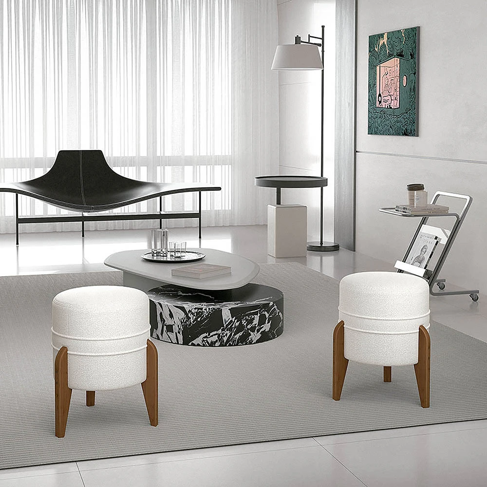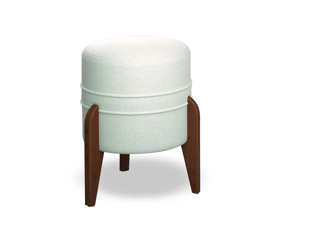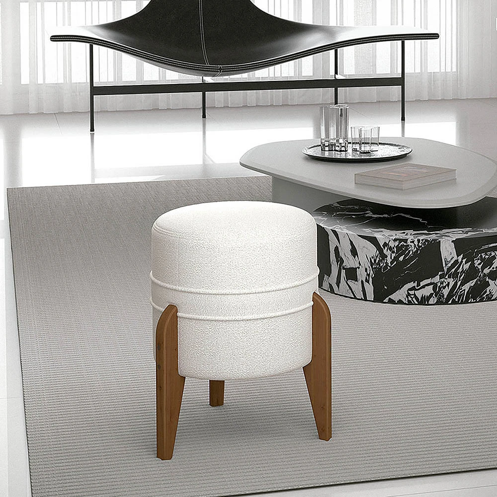 Pés em madeira aparente na cor natural. Seu tecido é tipo linho, com visual rústico e elegante. Produzido em Madeira de Lei reflorestada (eucalipto) com tratamentos anti-pragas. Possui grampos de aço galvanizado. Assento composto por espuma de alta resiliência e densidade, além de percintas elásticas (italiana) para maior conforto e sustentação. É embalado em caixa. ALTURA TOTAL: 0,46m I pés: 0,32m I DIÂMETRO: 0,34m I PESO: 4,2kg.