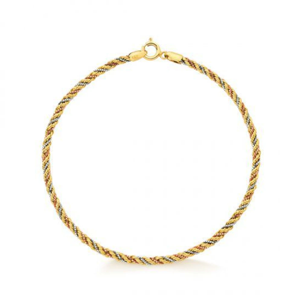 Pulseira feminina de ouro 18k, malha cordão baiano torcida. Ou popularmente conhecida como cabo de aço. Fecho tipo boia com mola de segurança.