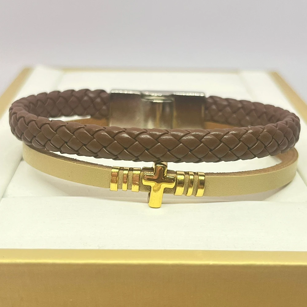 Pulseira Dupla Marrom e Bege Crucifixo Banhado em Ouro 18k - Fecho de Imã Prata