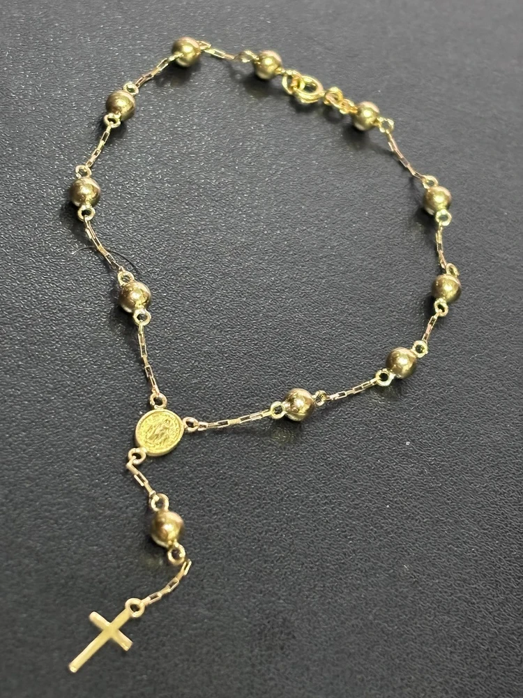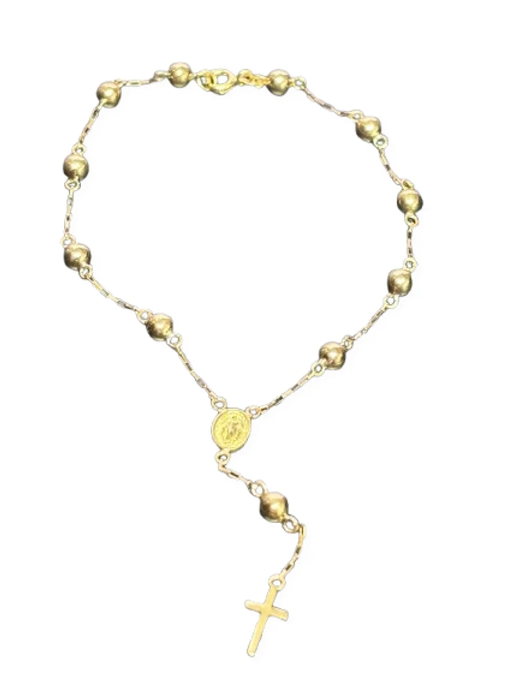 Para as devotas de Nossa Senhora Aparecida esta pulseira em formato de Terço é um presente mais que especial. Feita toda em ouro 18k sua corrente é trabalhada na delicada e resistente malha Veneziana, com uma medalha, e a cruz com Jesus Cristo, que fica pendurada, dando um charme todo especial à joia.