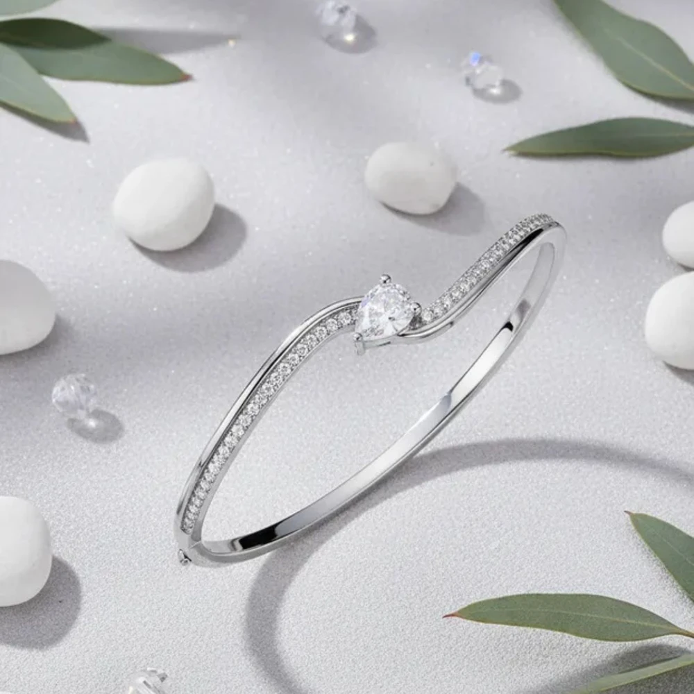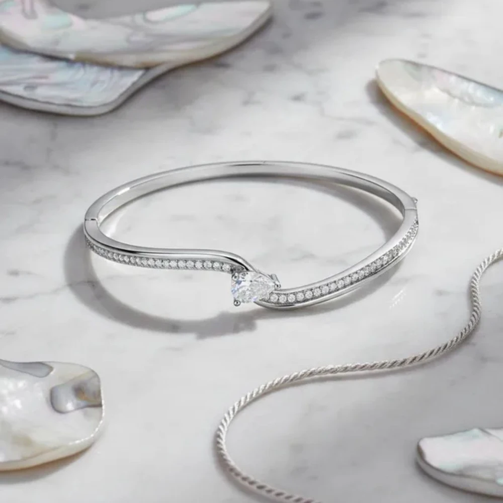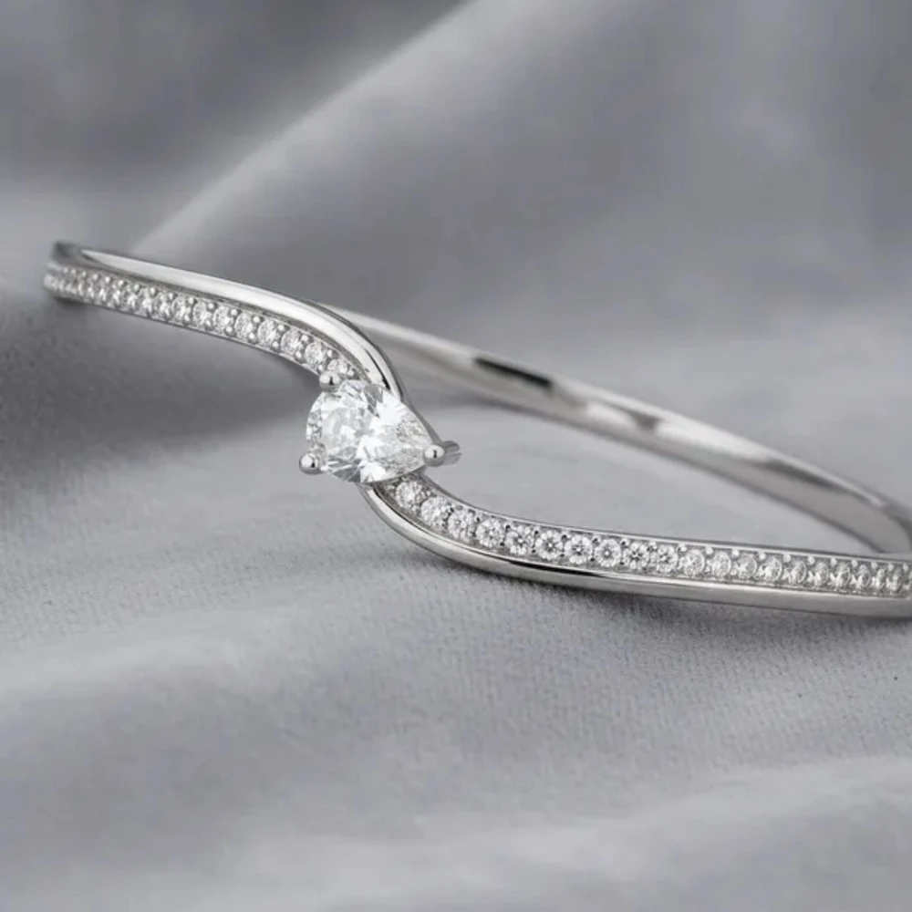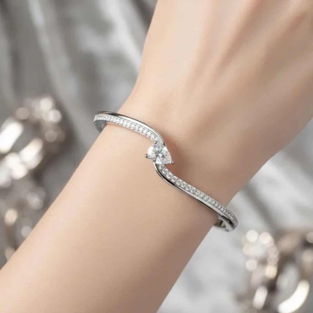 Bracelete curvo com cristal em gota e uma fileira de zircônias cravejadas ambas brancas, banhado a ródio.