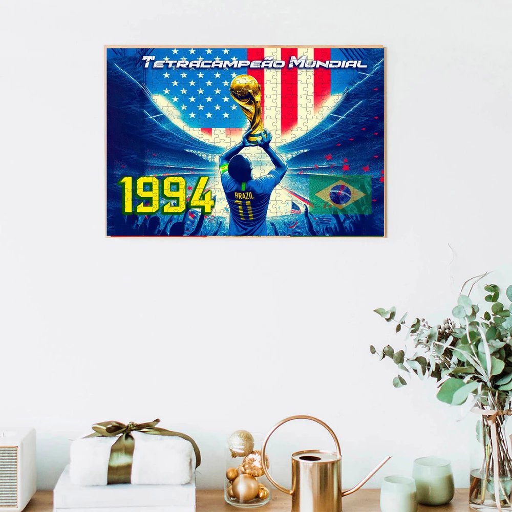 Mais do que um passatempo, este quebra-cabeça é uma verdadeira peça de decoração e memória histórica. Produzido em MDF, oferece excelente durabilidade e um encaixe preciso, permitindo que você monte e remonte quantas vezes quiser sem perder a qualidade. A imagem exclusiva criada por IA traz detalhes únicos da campanha vitoriosa de 1994, transformando cada montagem em uma viagem no tempo às glórias da Seleção.