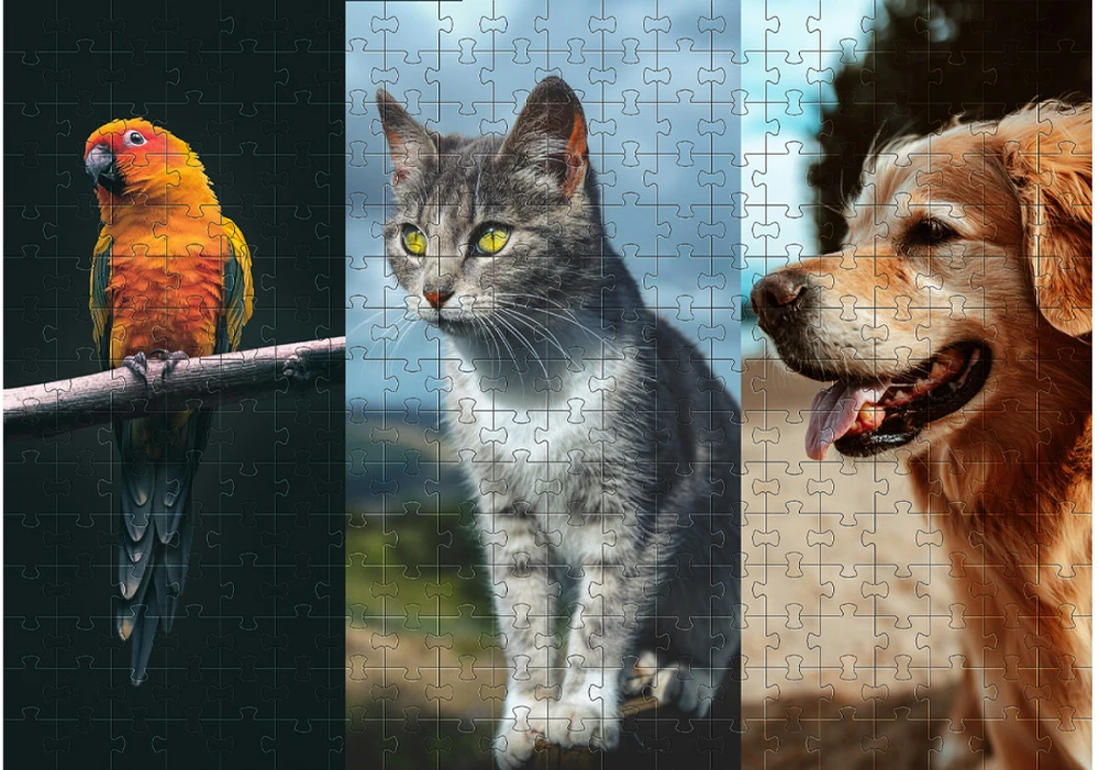 Quebra-Cabeça de Animais em MDF 300 Peças com Gato, Cachorro e Arara