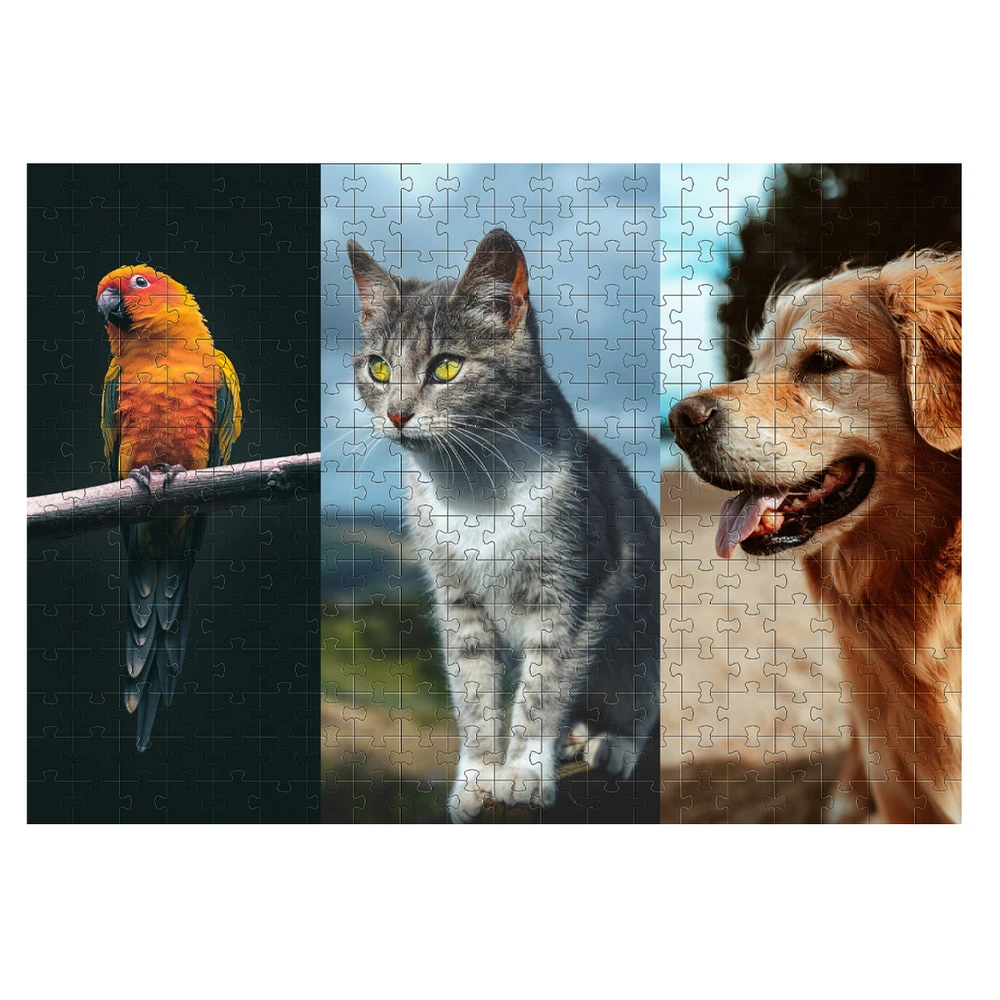 A cena retratada é encantadora: um cachorro, um gato e uma arara se olham, transmitindo uma sensação de harmonia entre diferentes espécies. As expressões dos animais e os detalhes coloridos da imagem criam uma atmosfera serena, capaz de prender a atenção e despertar o interesse do início ao fim. É o tipo de ilustração que convida a olhar com mais calma, valorizando cada parte da composição enquanto o quebra-cabeça vai sendo montado.
