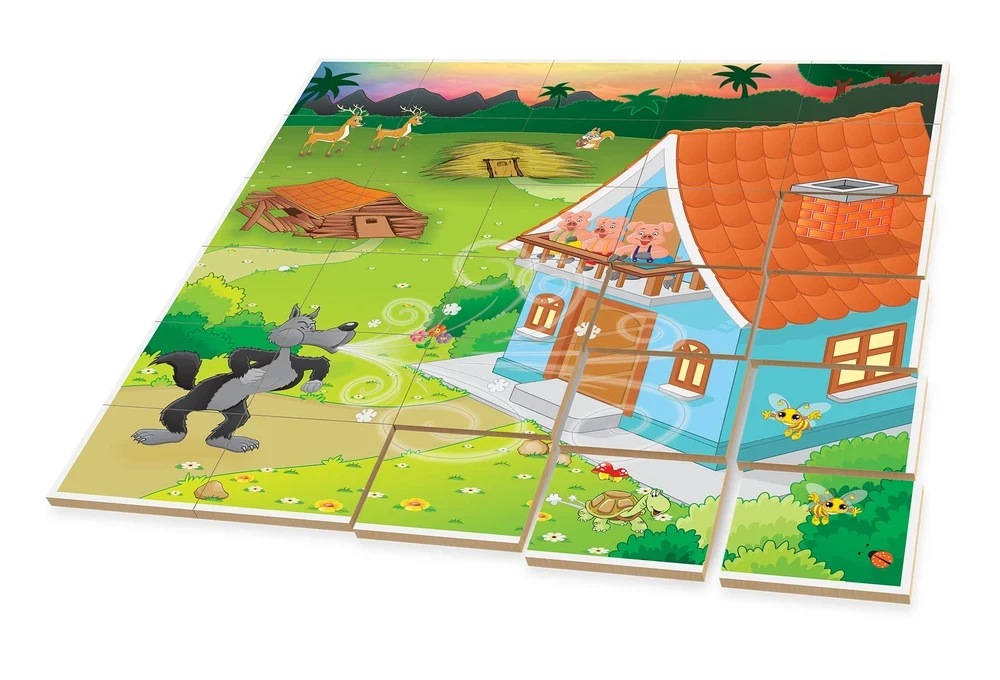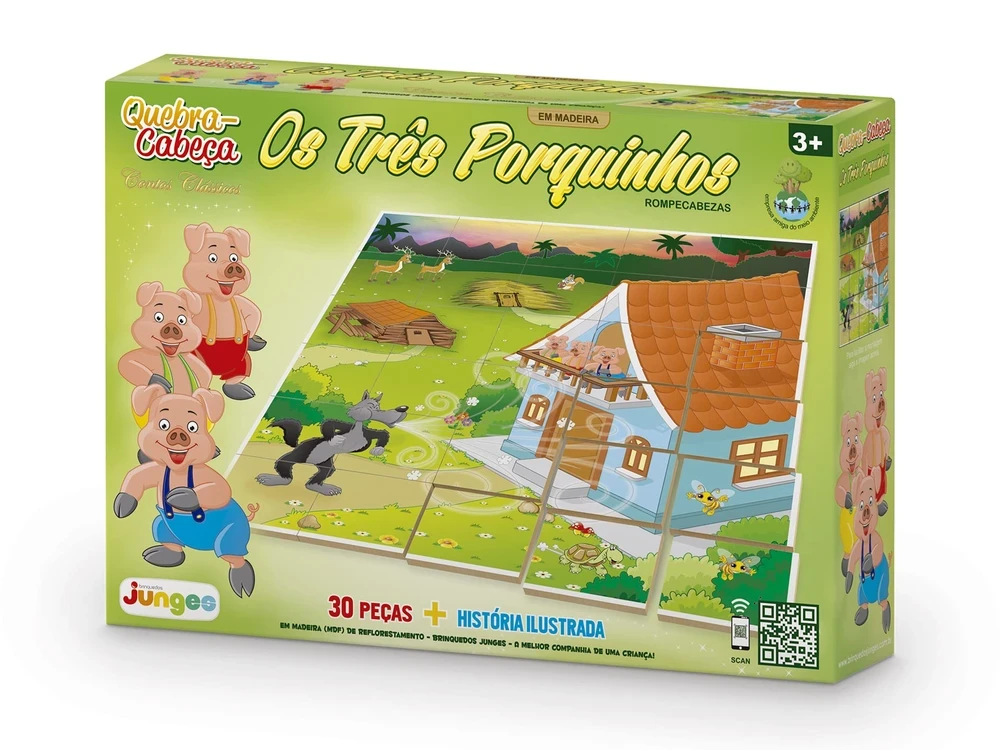O Quebra-Cabeça Os Três Porquinhos da Junges oferece uma experiência divertida e educativa, permitindo que as crianças montem a clássica história enquanto estimulam a imaginação. Produzido em madeira de reflorestamento com impressão direta de alta qualidade, cada peça é resistente e durável, incentivando o desenvolvimento do raciocínio lógico, da atenção e da concentração de forma lúdica.