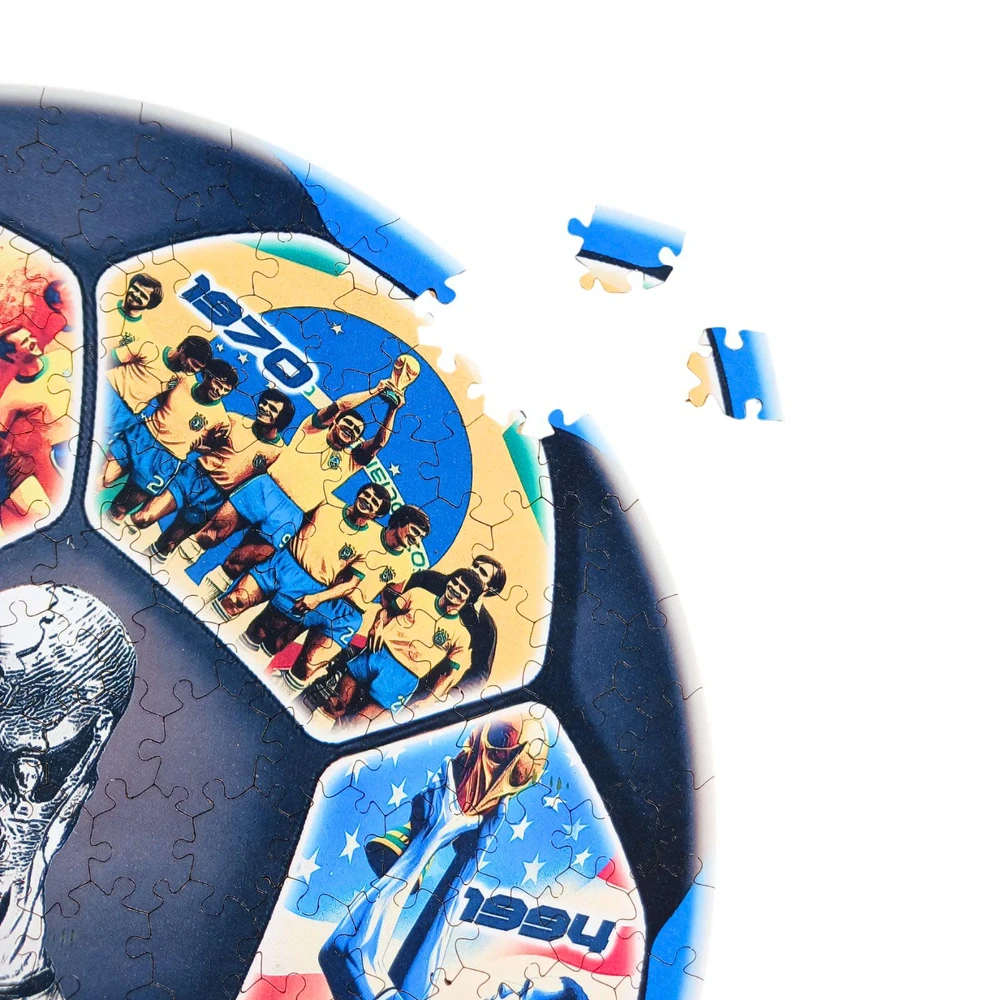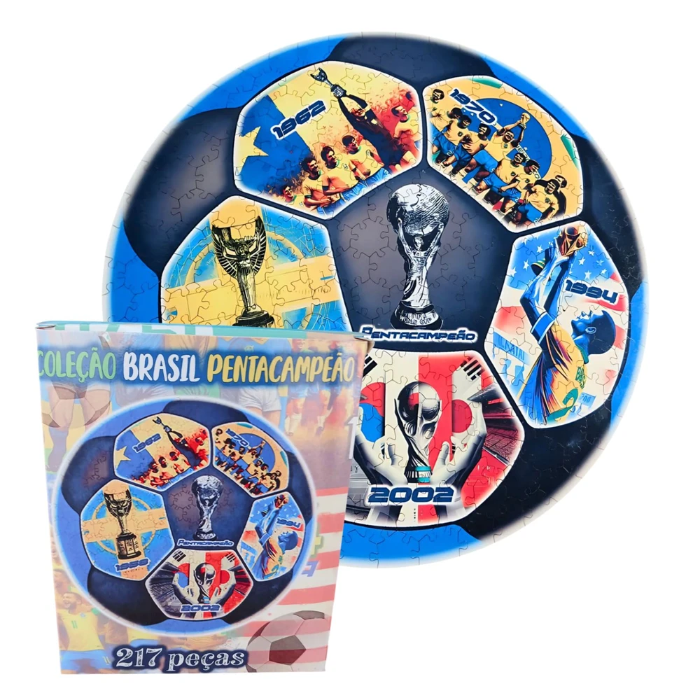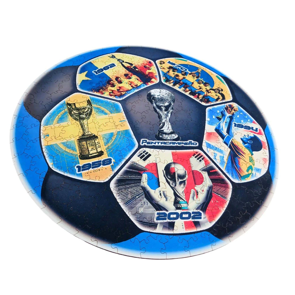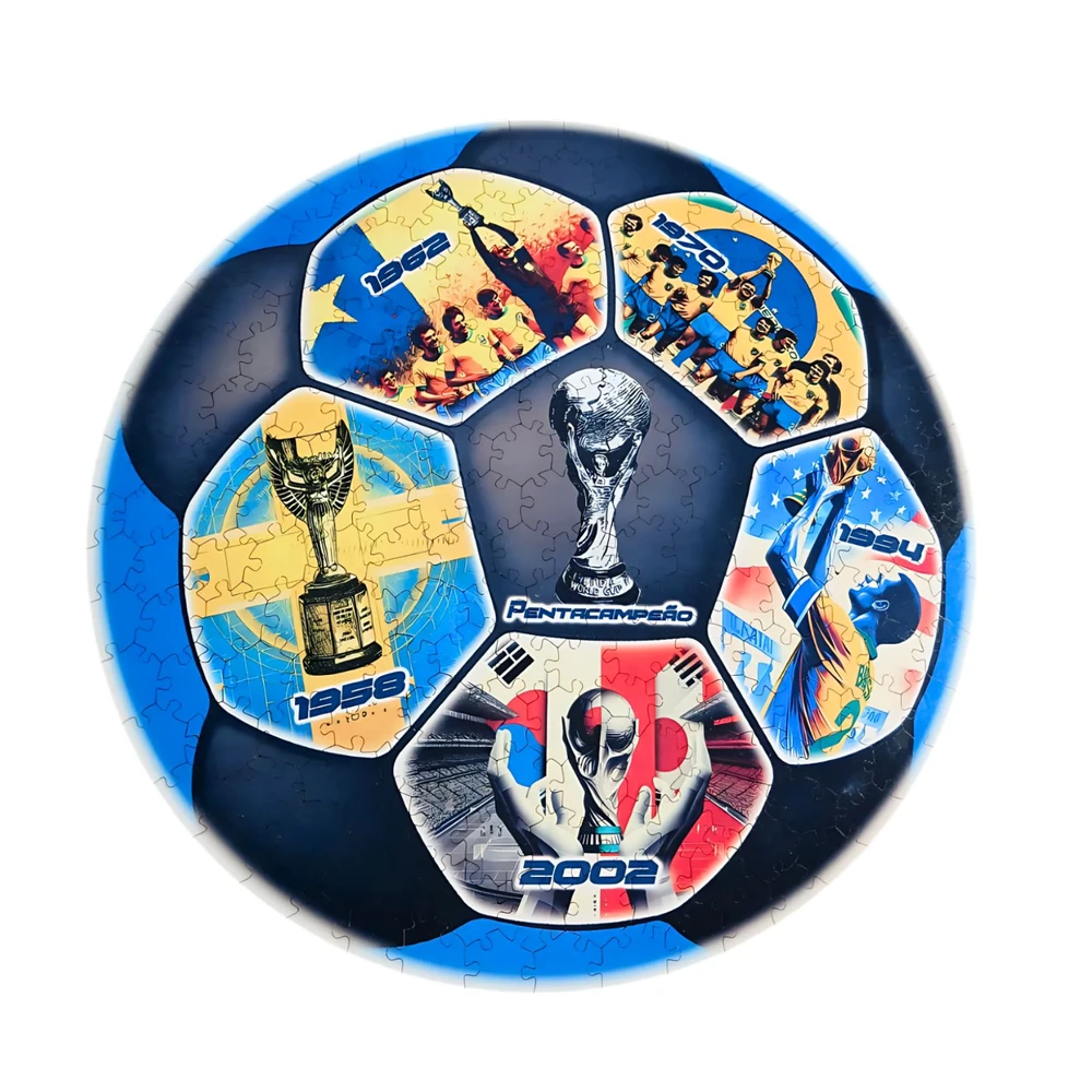 Este quebra-cabeça redondo de 217 peças é uma verdadeira homenagem à paixão nacional pelo futebol e às inesquecíveis conquistas da Seleção Brasileira nas Copas do Mundo. Produzido em MDF de alta qualidade, ele traz no centro a icônica Taça do Mundial, cercada por uma arte vibrante que celebra cada vitória do Brasil nos campos do mundo. Cada detalhe foi pensado com muito carinho para capturar a emoção, o orgulho e a história do nosso futebol, tornando esse item muito mais do que apenas um passatempo — é uma peça de memória afetiva para os apaixonados por esporte.