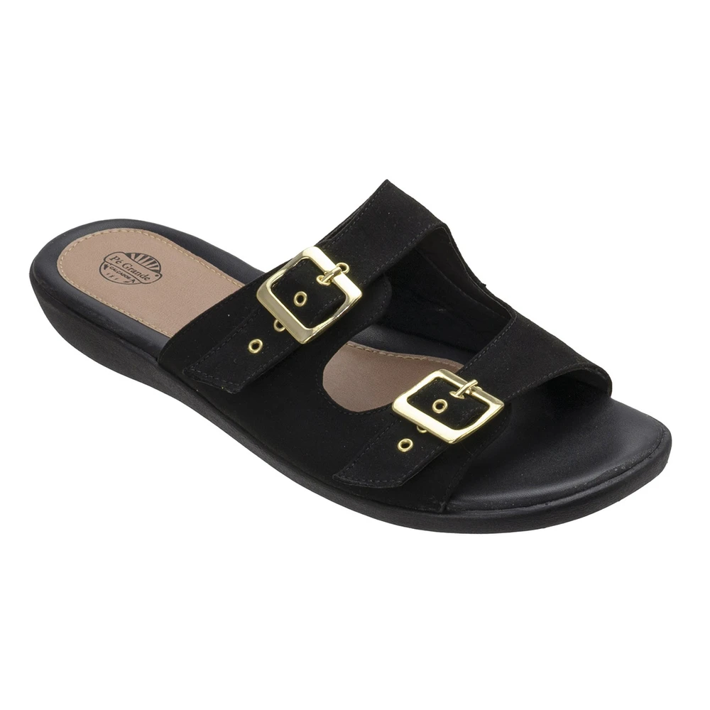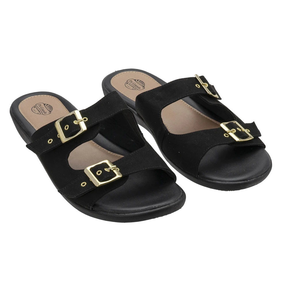 Rasteirinha em couro e solado de borracha antiderrapante.