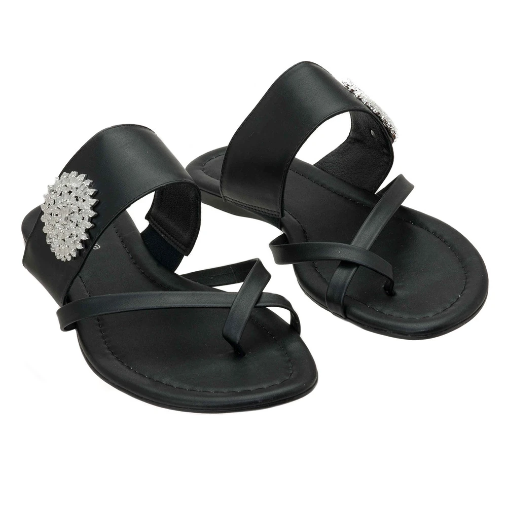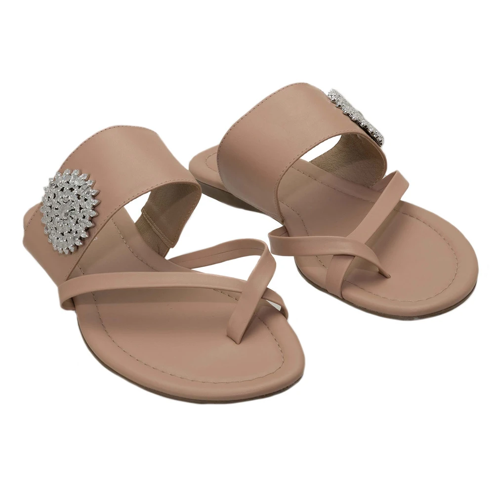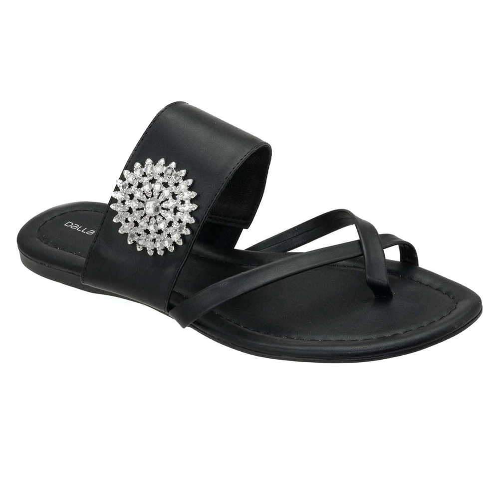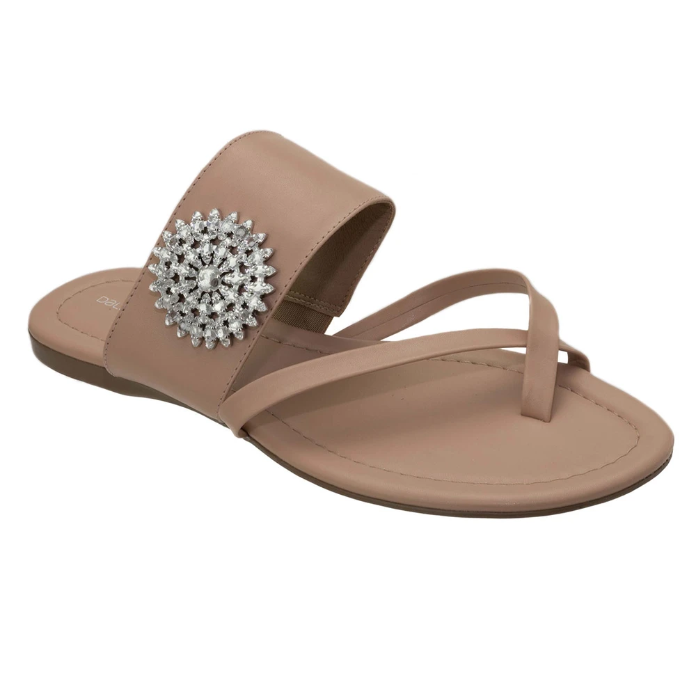 Sandália Rasteira em laminado sintético com solado em borracha antiderrapante.