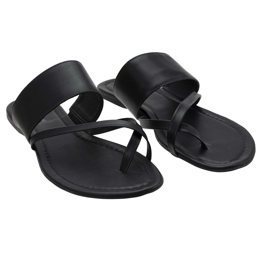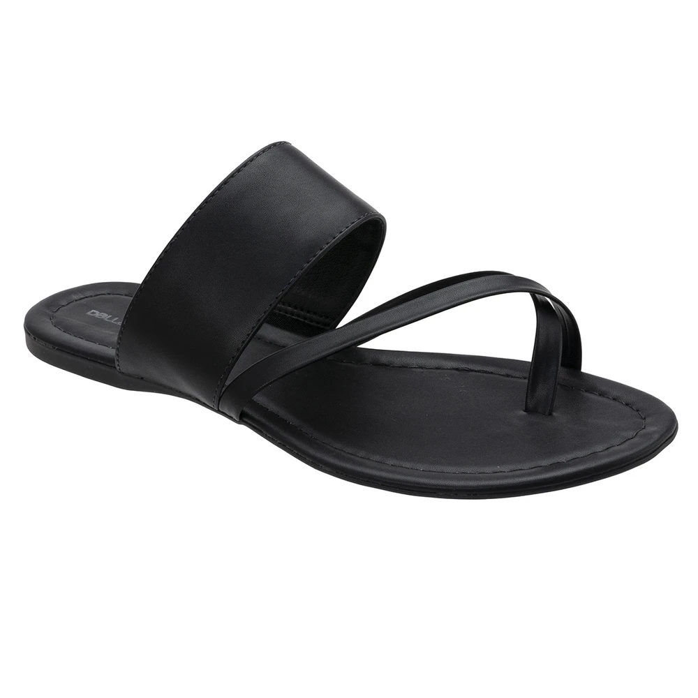 Sandália Rasteira em laminado sintético com solado em borracha antiderrapante.