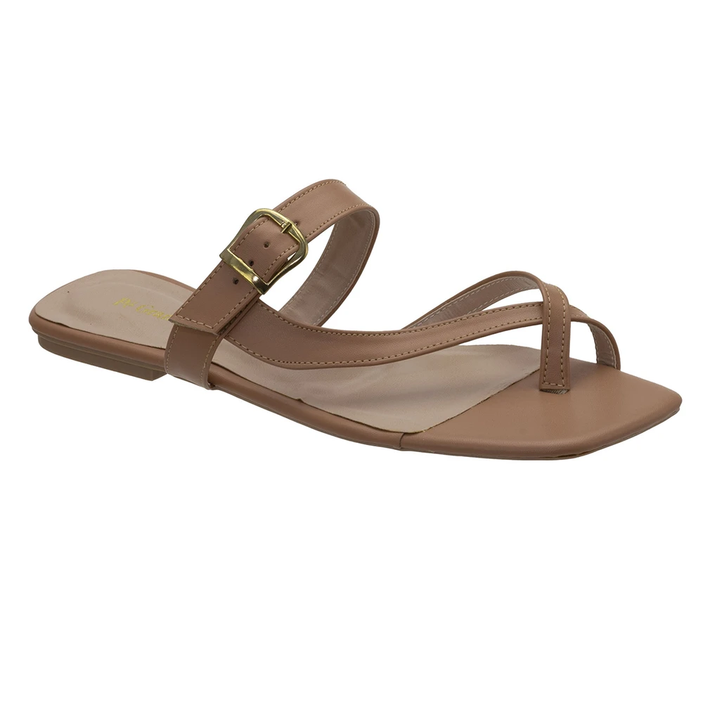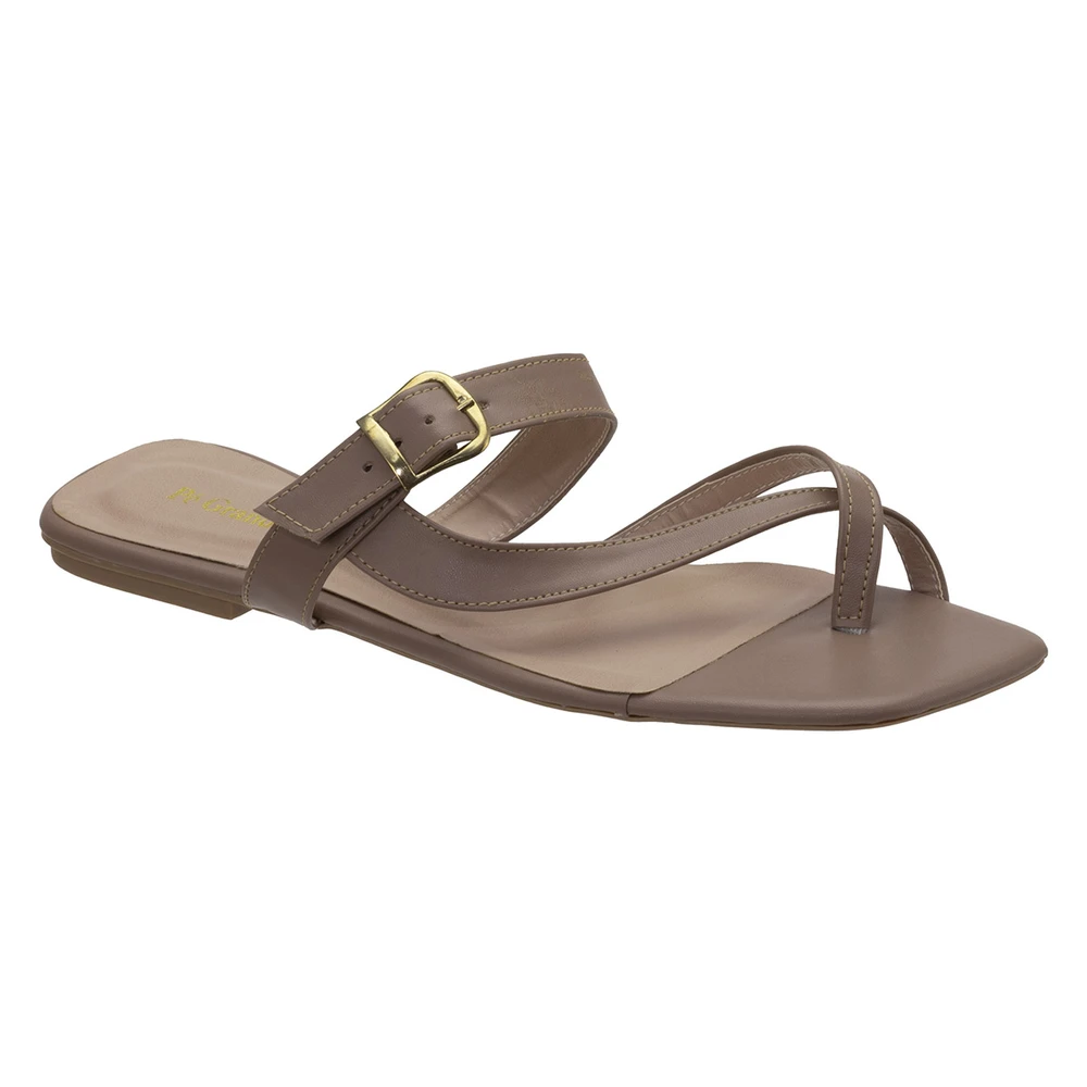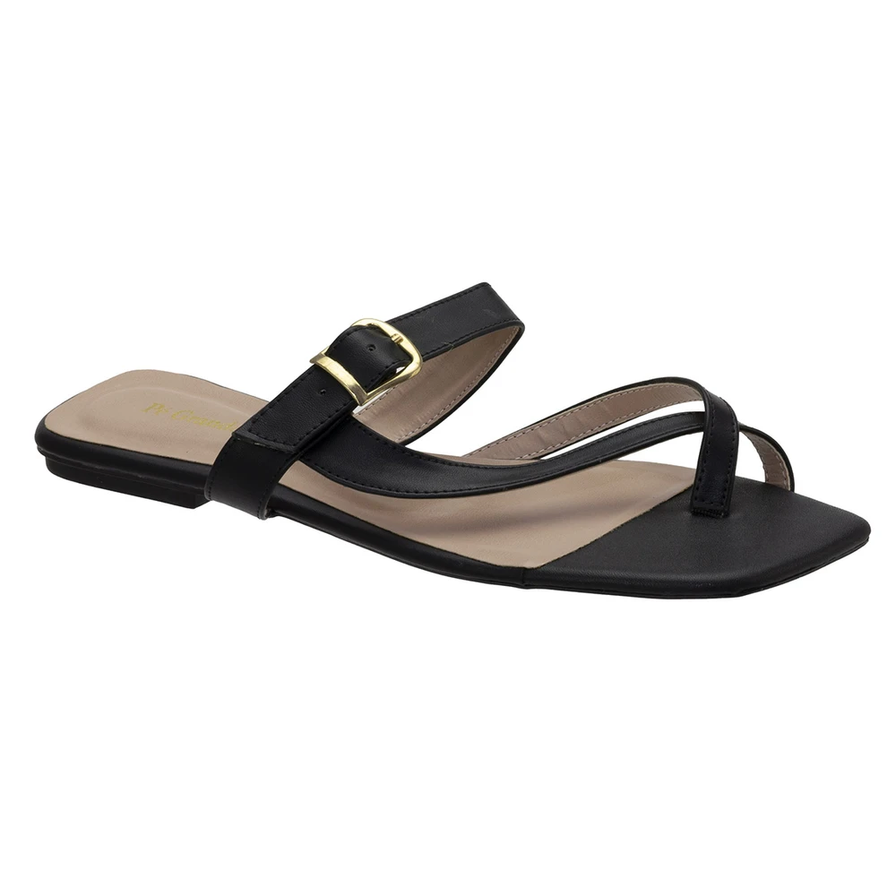 Rasteira em couro ecológico com solado em borracha antiderrapante.