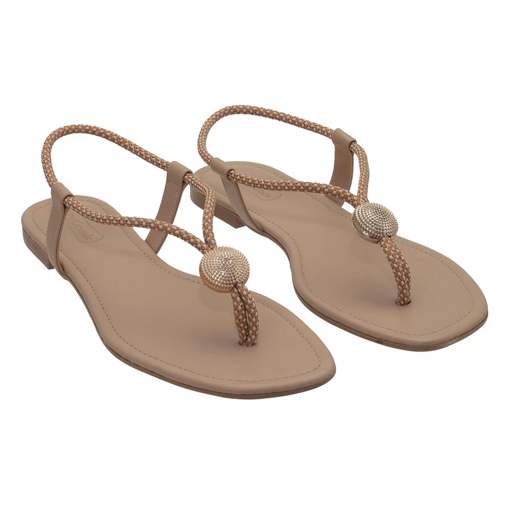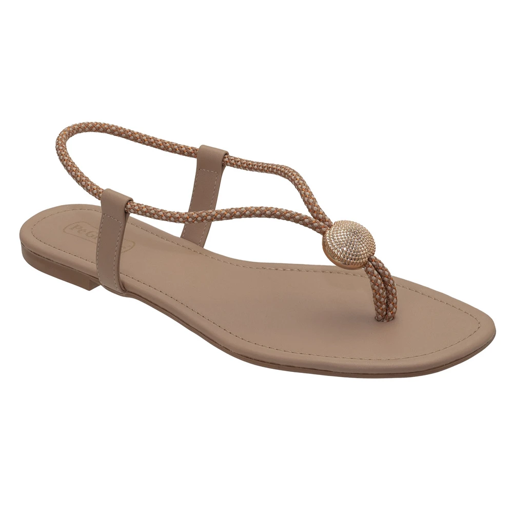 Rasteira em couro ecológico e tecido com solado em borracha antiderrapante.