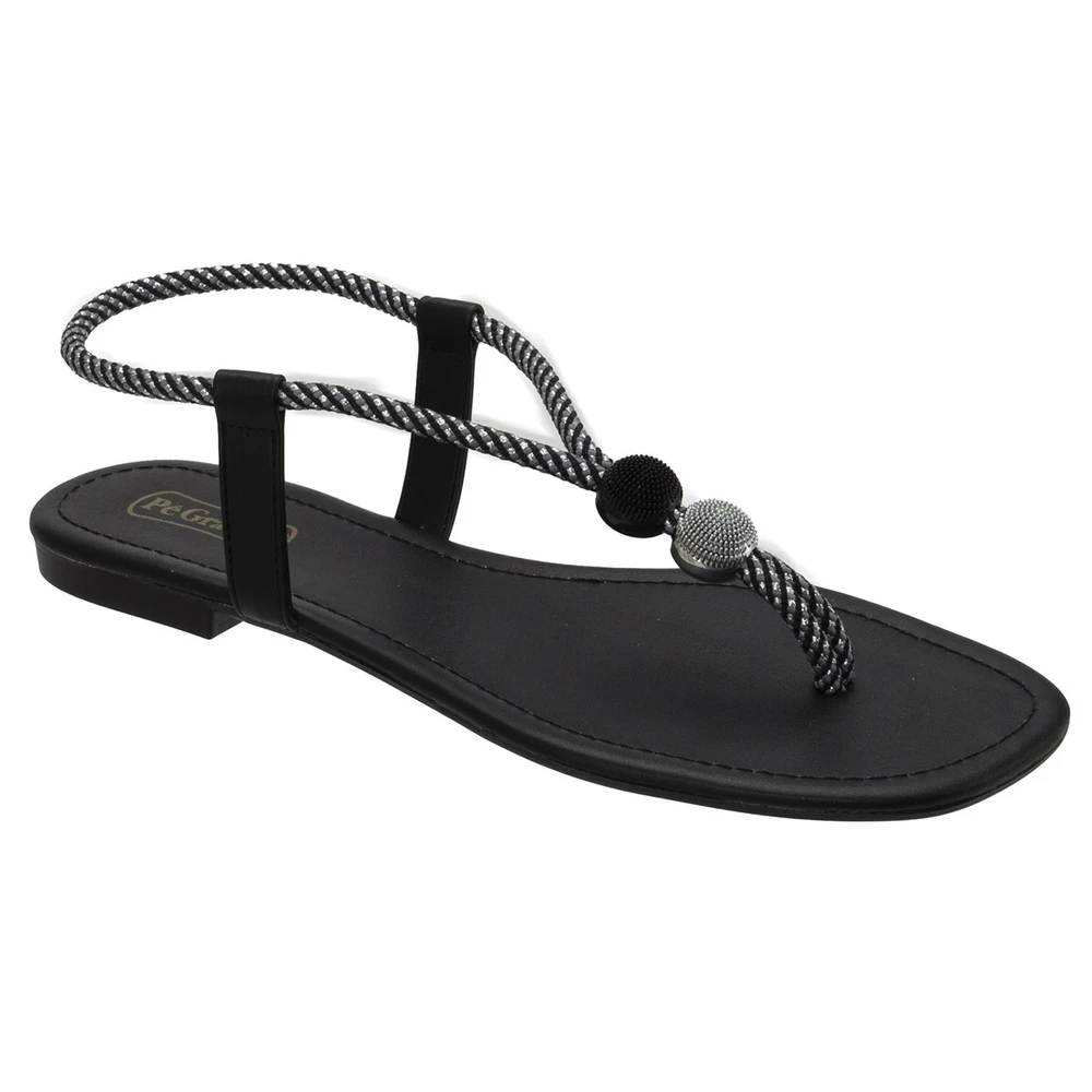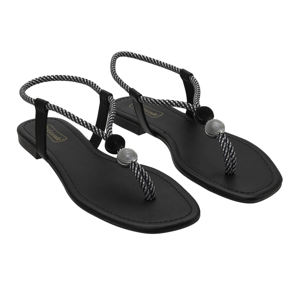 Rasteira em couro ecológico e tecido com solado em borracha antiderrapante.