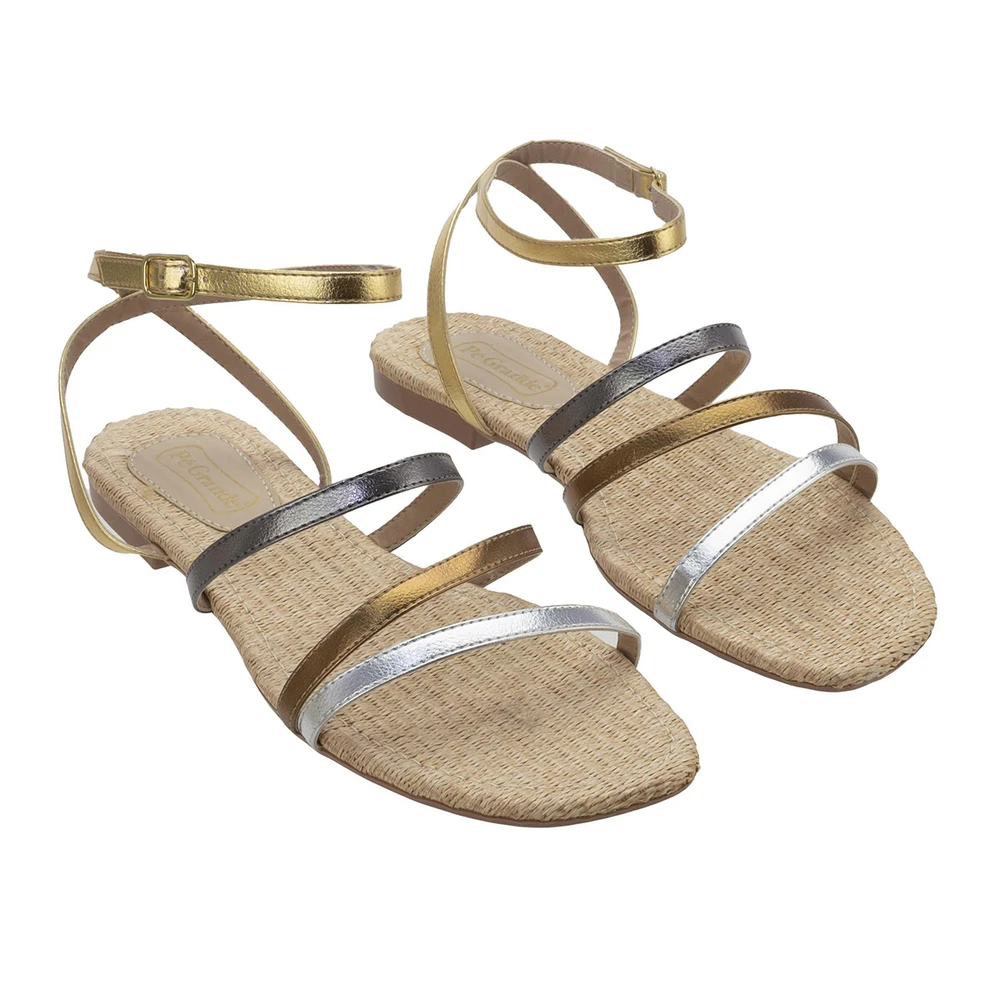 Rasteira em couro ecológico e tecido com solado em borracha antiderrapante.