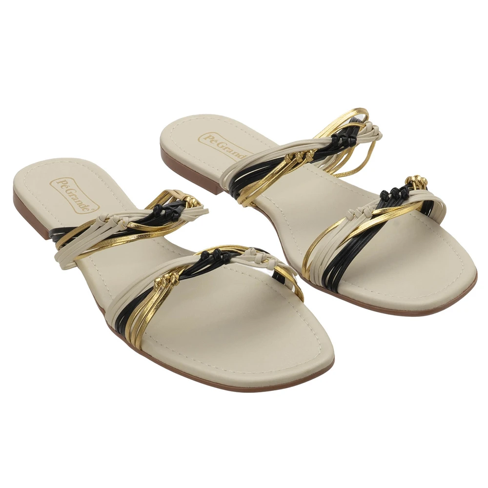 Rasteira em couro ecológico e tecido com solado em borracha antiderrapante.