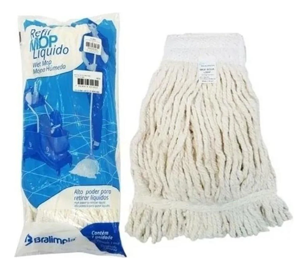 Refil para mop líquido com 85% de algodão e 15% de poliéster em sua composição.Tem alto poder de absorção e resistência. Suas pontas em Loop ?arrastam? e seguram mais as sujidades otimizando a limpeza e o tempo despendido nas tarefas. São produzidos em 5 cores que permitem que sejam identificados para utilização em ambientes específico evitando a transferência de contaminações de um ambiente para outro pelo próprio refil.
