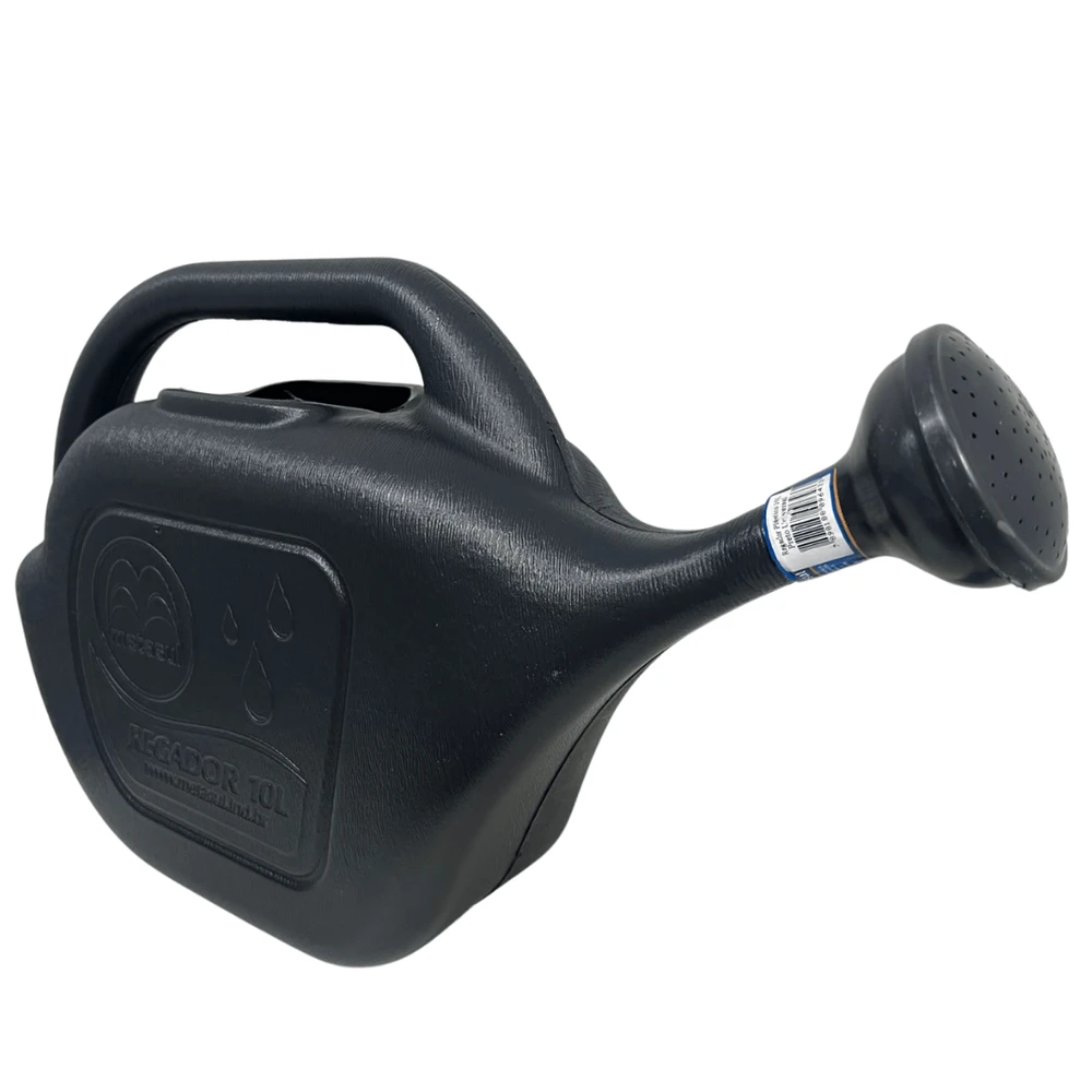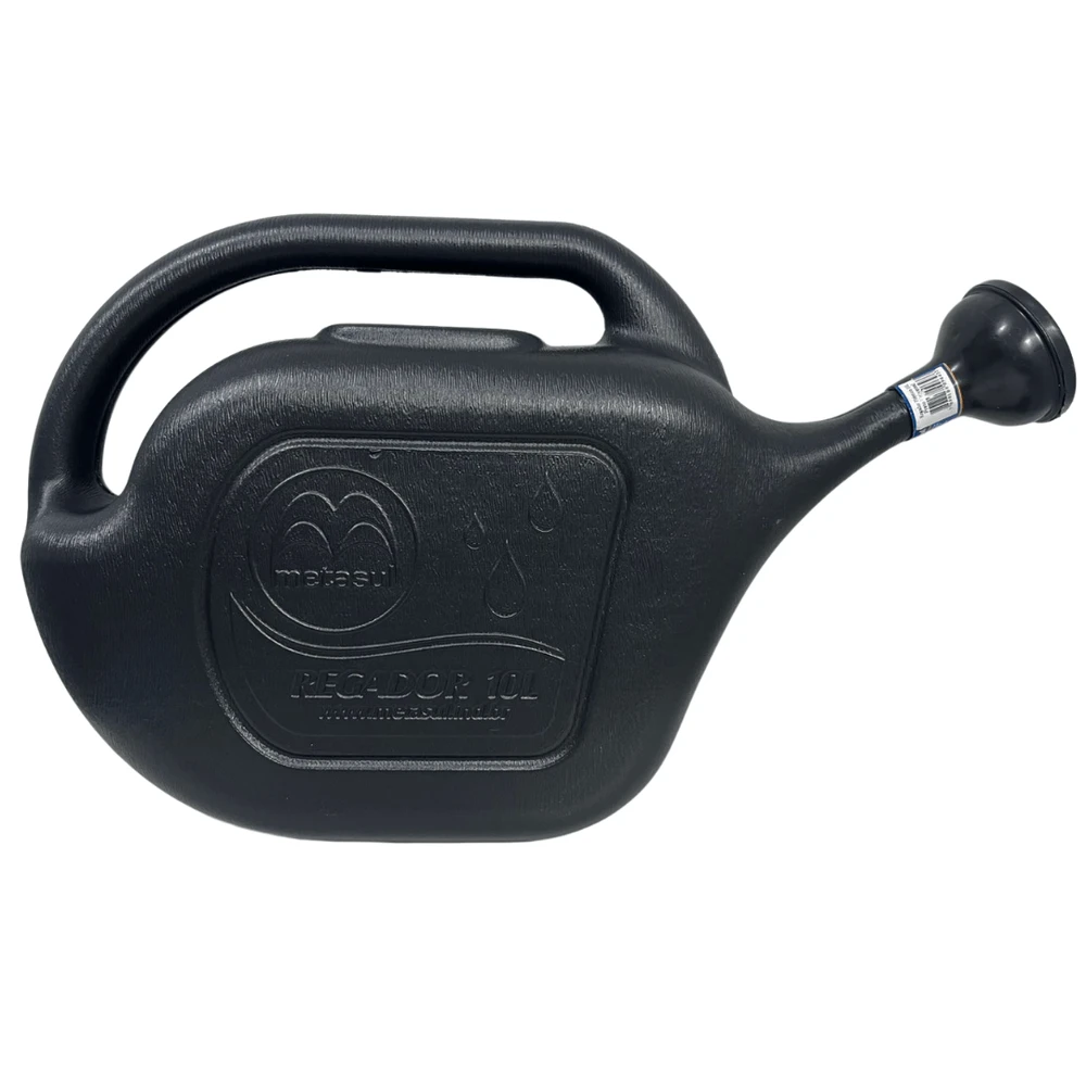 O regador vem com um recipiente e um bico tipo ducha (crivo), tornando-o fácil de usar e eficiente na distribuição de água. Sua cor preta dá um toque de elegância e sofisticação, combinando com qualquer decoração de jardim.