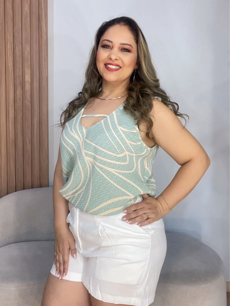 Com modelagem reta e caimento leve, a regata veste com conforto sem marcar o corpo, valorizando a silhueta de forma natural. O decote em V alonga visualmente o colo e adiciona um toque feminino e elegante ao visual.