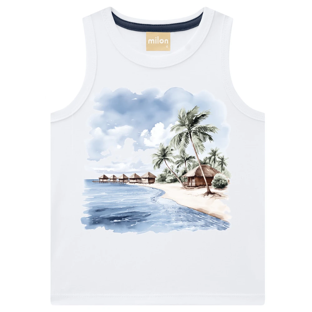 Descubra a Regata Infantil em Meia Malha Branca com Estampa Milon, perfeita para o conforto e estilo dos pequenos nos dias quentes. Confeccionada em meia malha 100% algodão, oferece toque macio e alta respirabilidade, ideal para manter a pele fresca e livre de irritações. A estampa exclusiva com paisagem tropical traz um visual leve e encantador, despertando a imaginação e o desejo de aventuras ao ar livre.