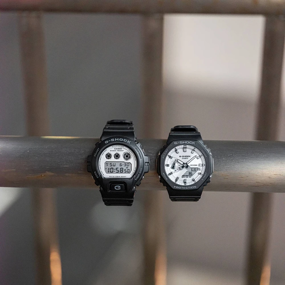 Seja ousado e confiante com um G-SHOCK extremamente simples em preto e branco de alto contraste. Começando com uma base de jato G-SHOCK preto e, em seguida, integrando um mostrador brilhante terminado em deposição de vapor branco brilhante. A afirmação monocromática é um estudo em contrastes: preto fosco contra branco brilhante.