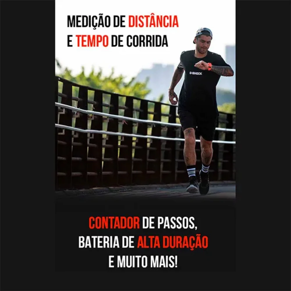 Cronômetro de 1/100 de segundo Capacidade de medição: 00'00"00~59'59"99 (nos primeiros 60 minutos) 1:00'00~23:59'59 (após 60 minutos) Unidade de medição: 1/100 de segundo (nos primeiros 60 minutos) 1 segundo (após 60 minutos) Modos de medição: tempo de volta/intermediário, exibição de distância/ritmo, tempo de volta automático/manual notificação de volta automática Capacidade da memória: Até os 45 registos mais recentes (mês de início da medição, data, hora, minuto, tempos de volta/intermediário, tempo total, distância, ritmo médio, calorias queimadas, número de voltas, tempo, distância, ritmo médio de cada volta/divisão)