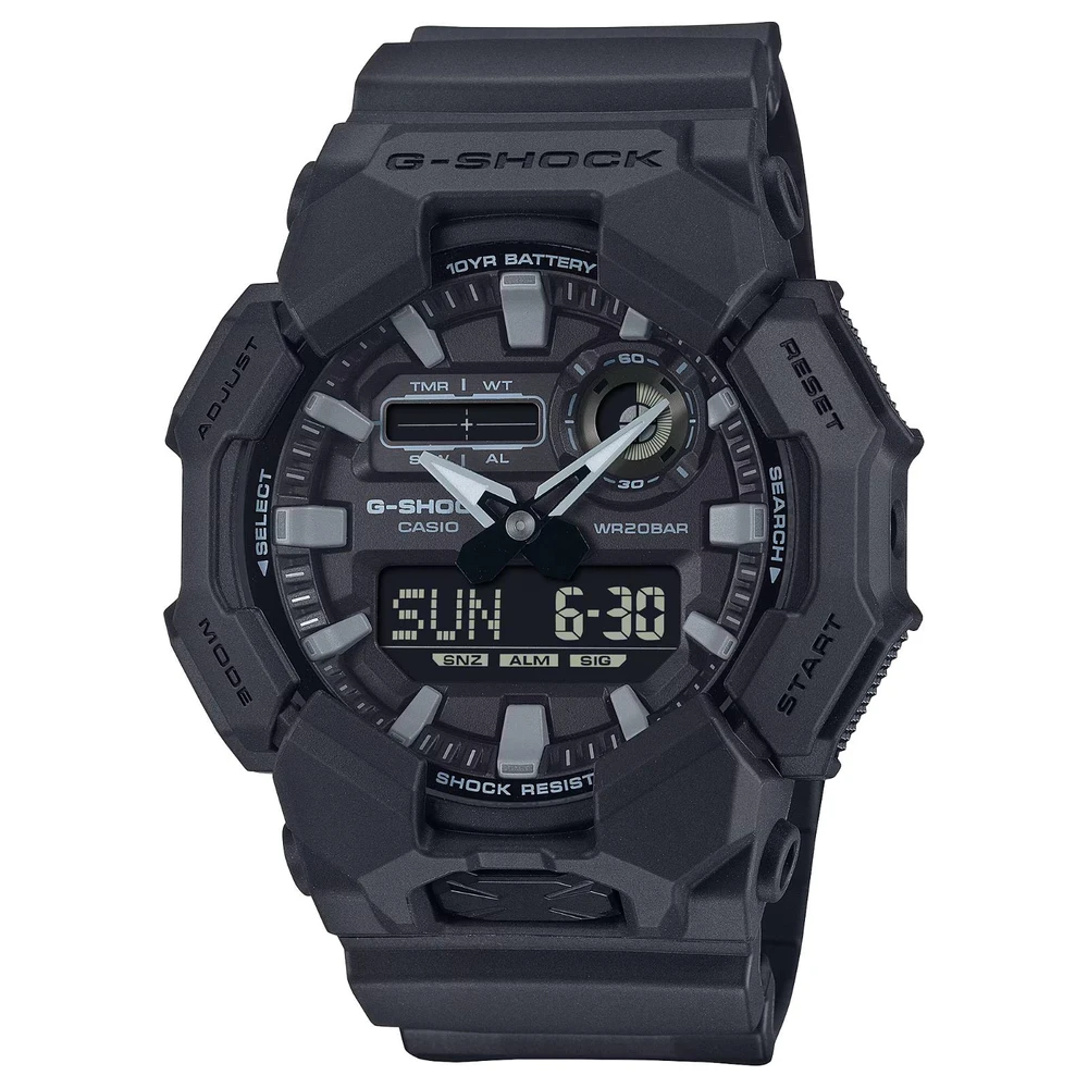 O GA-010 digital-analógico oferece recursos úteis como hora mundial e cronômetro, bem como uma luz de LED de alto brilho, que pode ser facilmente acessada a partir do grande botão na frente da caixa, garantindo visibilidade mesmo no escuro. Feito com resina de base biológica e equipado com uma bateria de 10 anos, este G-SHOCK é ótimo se você quiser reduzir o impacto ambiental. Disponível em uma seleção de esquemas de cores de estilo de trabalho baseados em preto para um design legal que transita com facilidade de cenários casuais para situações de trabalho.