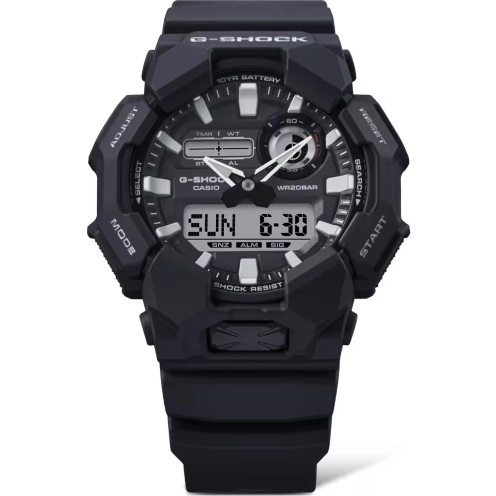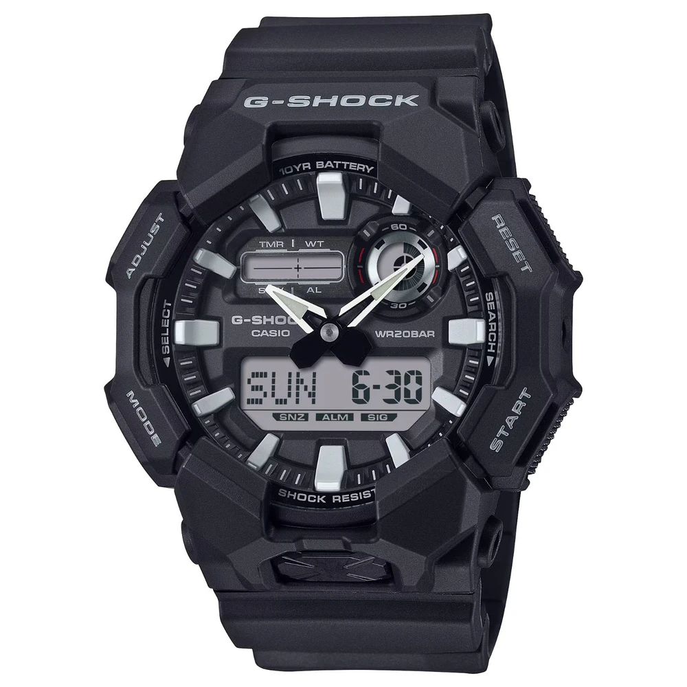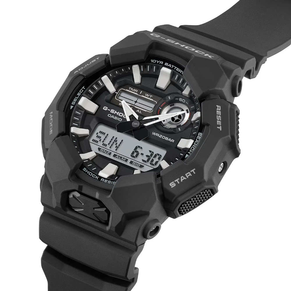 O GA-010 digital-analógico oferece recursos úteis como hora mundial e cronômetro, bem como uma luz de LED de alto brilho, que pode ser facilmente acessada a partir do grande botão na frente da caixa, garantindo visibilidade mesmo no escuro. Feito com resina de base biológica e equipado com uma bateria de 10 anos, este G-SHOCK é ótimo se você quiser reduzir o impacto ambiental. Disponível em uma seleção de esquemas de cores de estilo de trabalho baseados em preto para um design legal que transita com facilidade de cenários casuais para situações de trabalho.
