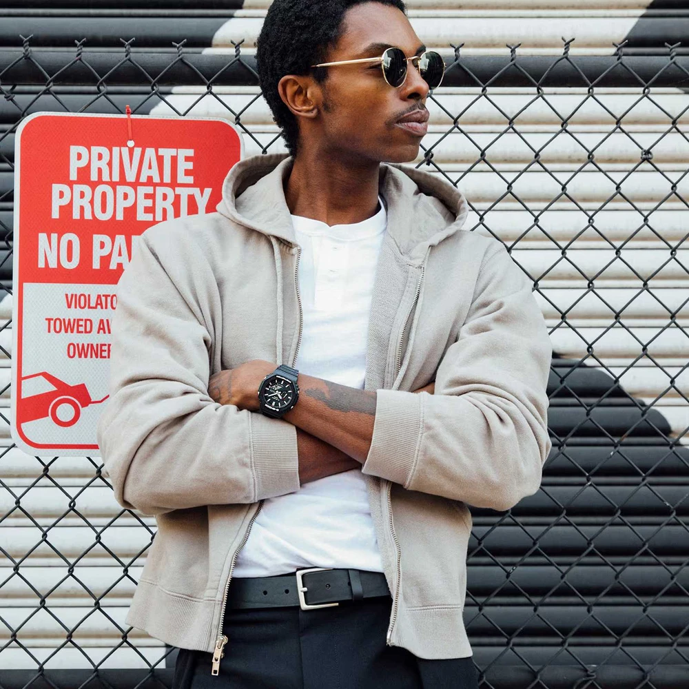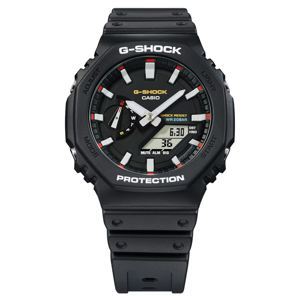 Um relógio simples e aerodinâmico com aro octogonal. O esquema de cores original é reproduzido fielmente com toques de vermelho G-SHOCK, representando a paixão por encarar desafios; azul, simbolizando excelente resistência à água; e amarelo, significando excelente resistência a choques.