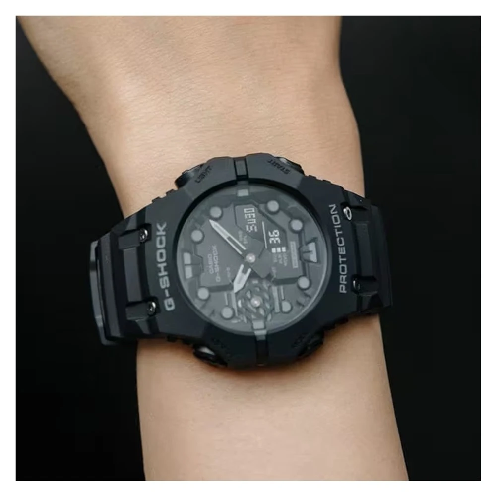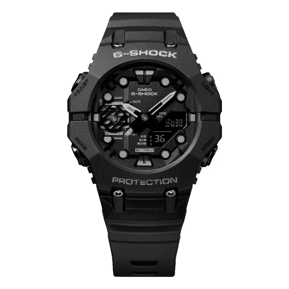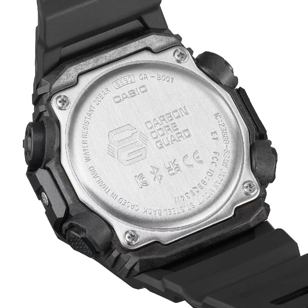 Apresentamos a linha GA-B001 de relógios G-SHOCK, que conta com um novo design robusto e a funcionalidade Smartphone Link Arrojadas combinações de cores são inspiradas no sofisticado estilo urbano. Mais do que apenas sofisticação, esses relógios também fornecem funcionalidade completa. Sincronize o relógio com seu smartphone via Bluetooth® e toque no aplicativo exclusivo para acessar as funções desejadas. A linha GA-B001 apresenta uma estrutura inovadora, com moldura composta por dois componentes separados, um superior e outro inferior, que se conectam nas posições das 9 e das 3 horas. Esse maravilhoso recurso é complementado por uma atenção minuciosa aos detalhes dos marcadores indicativos e pelo exclusivo formato do visor LCD, inédito em um G-SHOCK até agora. As opções de cores incluem as opções totalmente em preto, preto ou azul-turquesa com gradação translúcida, ou a mais nova opção, vermelho.