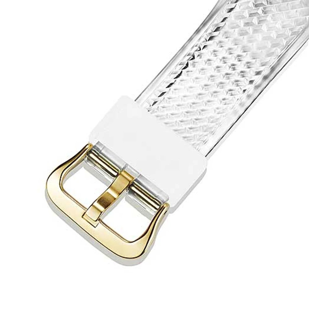 As pulseiras desses modelos são feitas em resina transparente, destacando ainda mais a moldura em metal dourado.