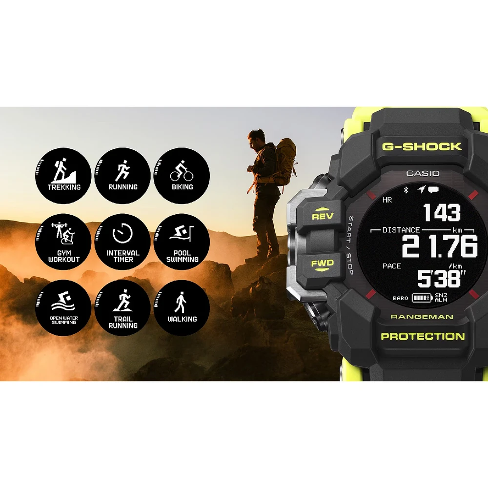 O RANGEMAN GPR-H1000RY é desenvolvido com uma estrutura resistente a poeira, lama e impactos, e também conta com seis sensores que realizam uma variedade de medições, incluindo batimento cardíaco, além de GPS integrado para medir localização, distância e velocidade de deslocamento. Acompanhe sua condição física em tempo real durante 9 atividades diferentes, incluindo trekking.
