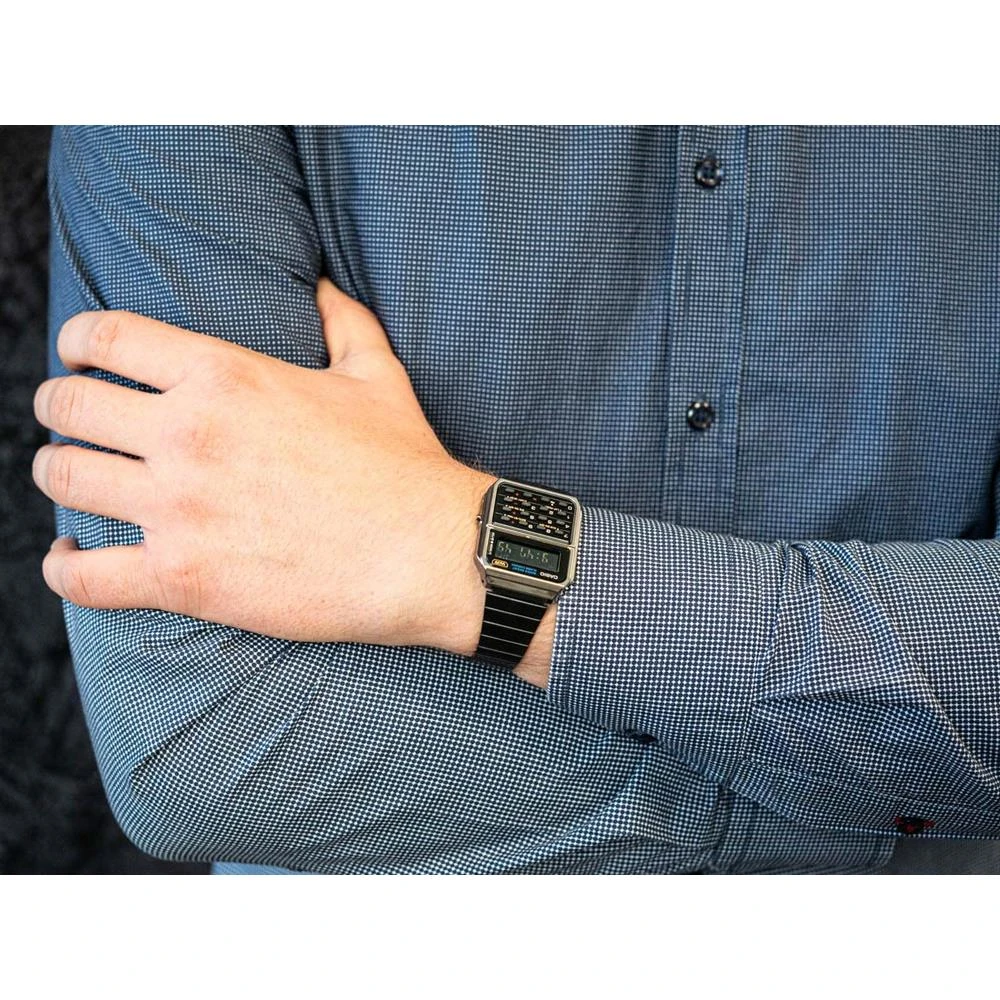 Visor: LCD Funções: Digital, Calendário, Dual Time, Calculadora de 8 Dígitos, Cronógrafo, Alarme, Sinal HorárioResistência à Água: 30mDiâmetro da Caixa: 34 mm x 44 mmCaracterísticas: com caixa em Resina Prateada e pulseira em Aço Inoxidável GrafiteFundo: ParafusadoVidro: ResinaModelo: Relógio CalculadoraGarantia de 1 Ano