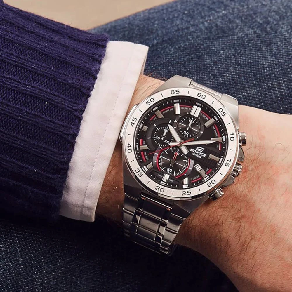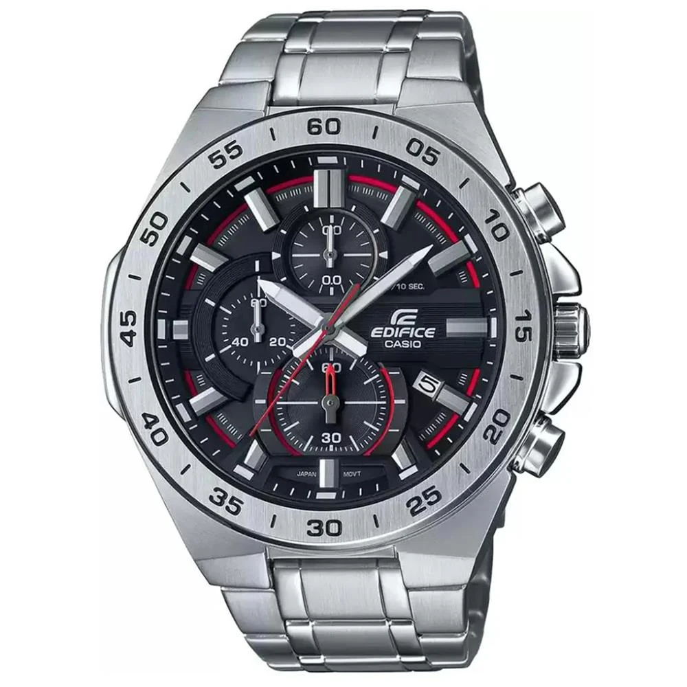 Visor: Preto com Detalhes em VermelhoFunções: Analógico, Cronógrafo, CalendárioResistência à Água: 100mDiâmetro da Caixa: 46 mmCaracterísticas: com caixa em Aço Inoxidável e pulseira em Aço InoxidávelFundo: RosqueadoAlimentação do Maquinário: BateriaVidro: Cristal MineralMaquinário JaponêsLinha: Casio EdificeAro FixoGarantia de 1 Ano