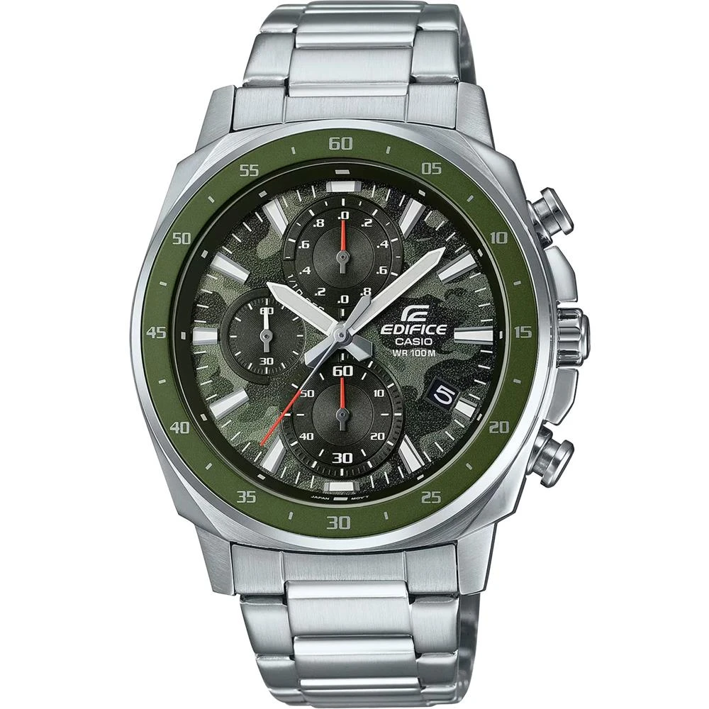 Visor: Verde Estilo Militar (Camuflagem)Funções: Analógico, Cronógrafo, CalendárioResistência à Água: 100mDiâmetro da Caixa: 42 mmCaracterísticas: com caixa em Aço Inoxidável e pulseira em Aço InoxidávelFundo: RosqueadoAlimentação do Maquinário: BateriaVidro: Cristal MineralMaquinário JaponêsLinha: Casio EdificeGarantia de 1 Ano