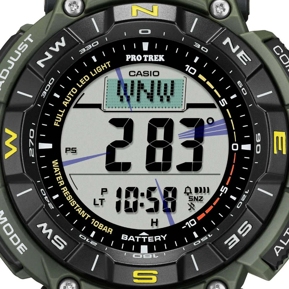 A linha PRO TREK de equipamento autêntico para o exterior destinado aos amantes da natureza apresenta o PRG-340, um relógio que incorpora bioplásticos ecológicos, enquanto proporciona o mesmo ajuste confortável para o seu pulso. A caixa e a bracelete de uretano são fabricadas a partir de bioplásticos feitos com óleo de rícino e a bracelete de bioplásticos feitos com milho. O LCD duplex define camadas separadas para os gráficos da bússola e as funções do relógio, permitindo uma visualização maior da bússola para uma melhor legibilidade e navegação mais fácil num design tanto funcional quanto bonito.