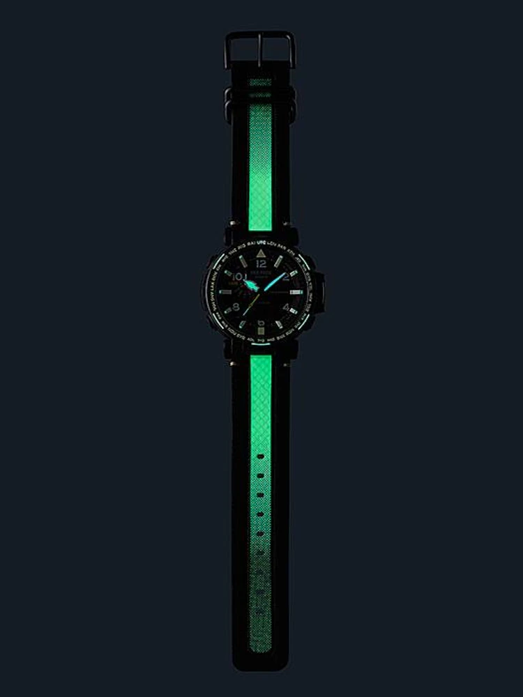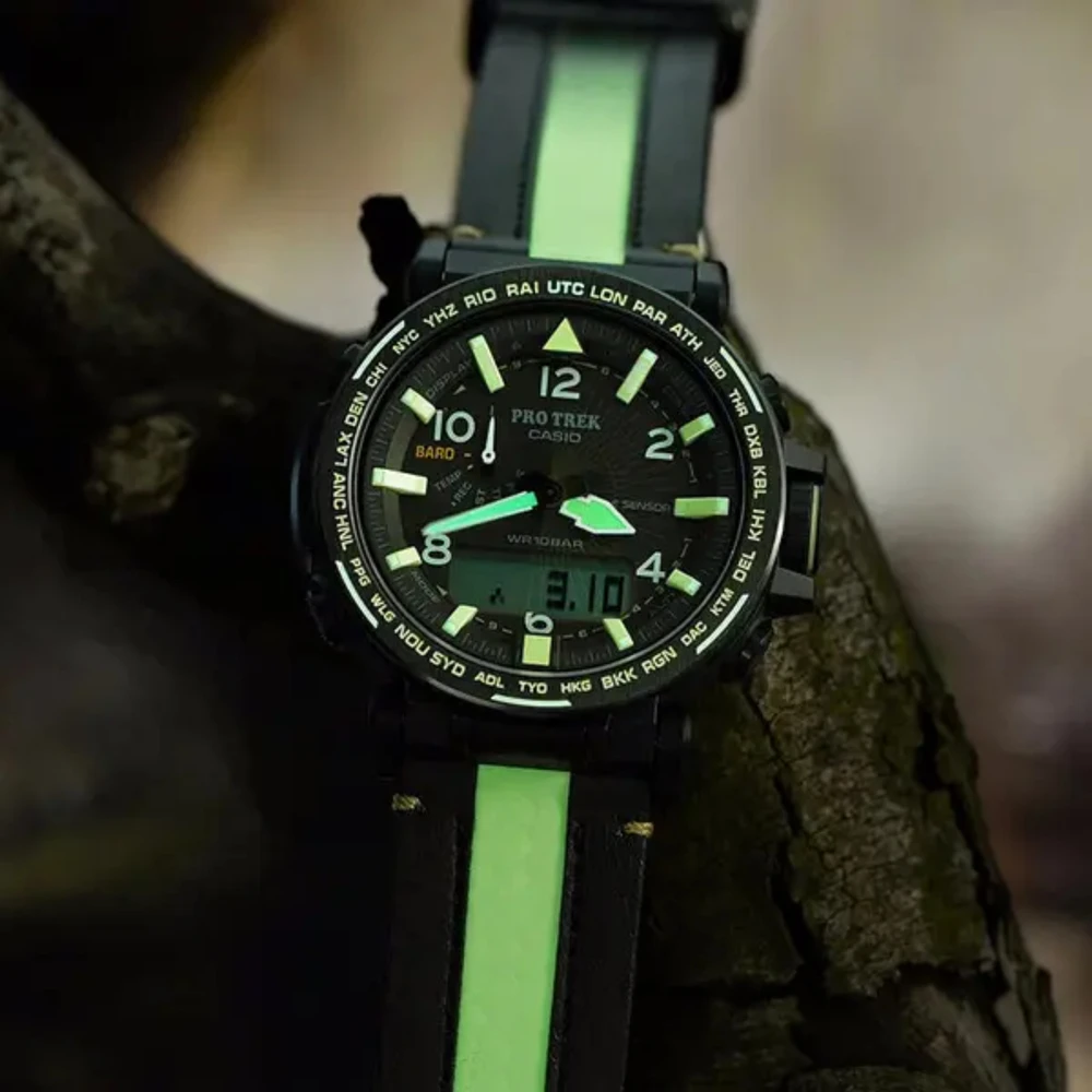 Esse relógio é temático na espeleologia (exploração de cavernas). Um preto profundo que evoca a escuridão das cavernas forma a cor base do relógio, enquanto laranjas e amarelos que lembram roupas de espeleologia são usados em todos os lugares para realçar as cores. Além disso, uma pulseira de couro fosforescente é usada ao lado de um material fosforescente usado como cor de preenchimento dos índices e bisel, fazendo o relógio brilhar no escuro. Isso aumenta a visibilidade à noite. Além disso, o protetor de pulseira de aço inoxidável tem acabamento em IP preto para expressar a escuridão do preto azeviche e para obter resistência ao desgaste e alta qualidade. Em termos de funcionalidade, é equipado com um sensor triplo que pode medir direção, altitude/pressão atmosférica e temperatura, Tough Solar e uma função de retração da mão.