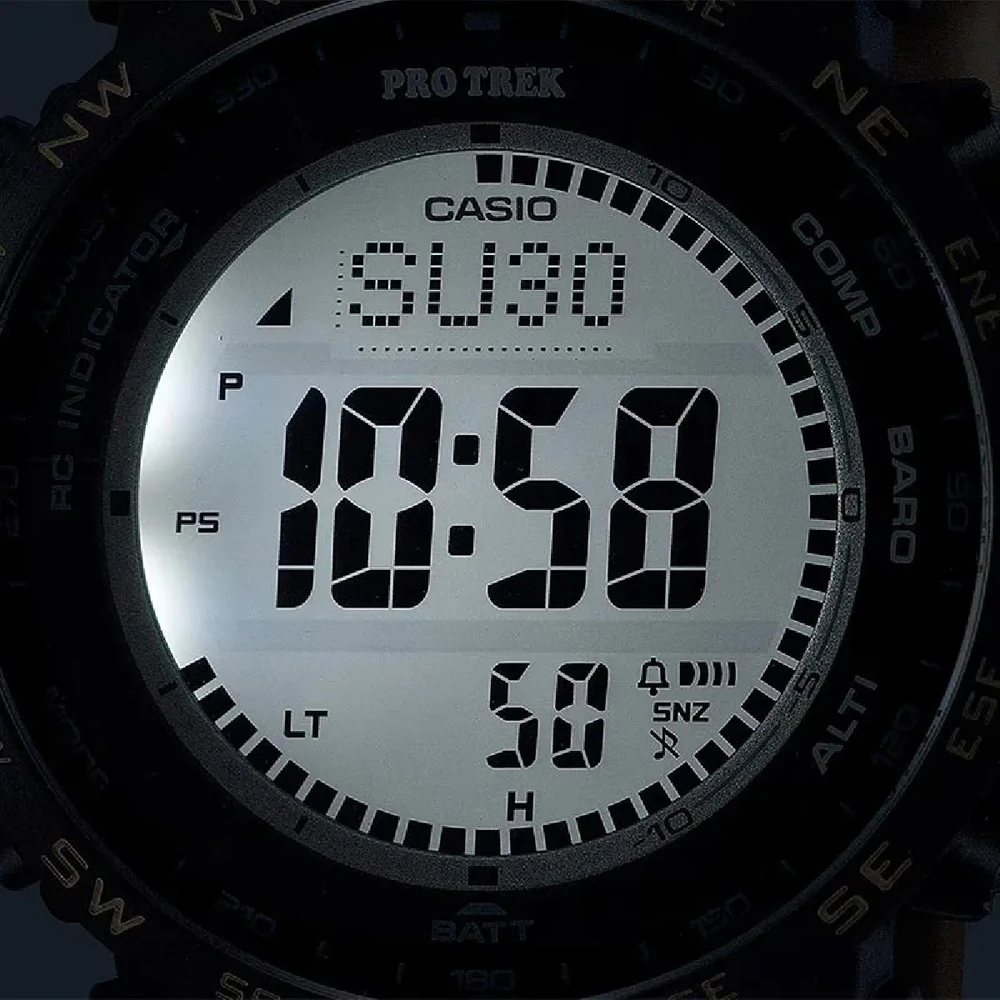 Com o primeiro LCD fosforescente num relógio CASIO, este PRO TREK é o companheiro ideal para actividades noturnas ao ar livre. O material luminoso por baixo do mostrador digital emite um brilho suave que aumenta a visibilidade para que possa verificar rapidamente as horas no escuro. Apenas 1 minuto de exposição a uma lanterna de cabeça de montanhismo de 200 lúmenes a 5 cm de distância pode fornecer energia suficiente para iluminar o mostrador até 1 hora.