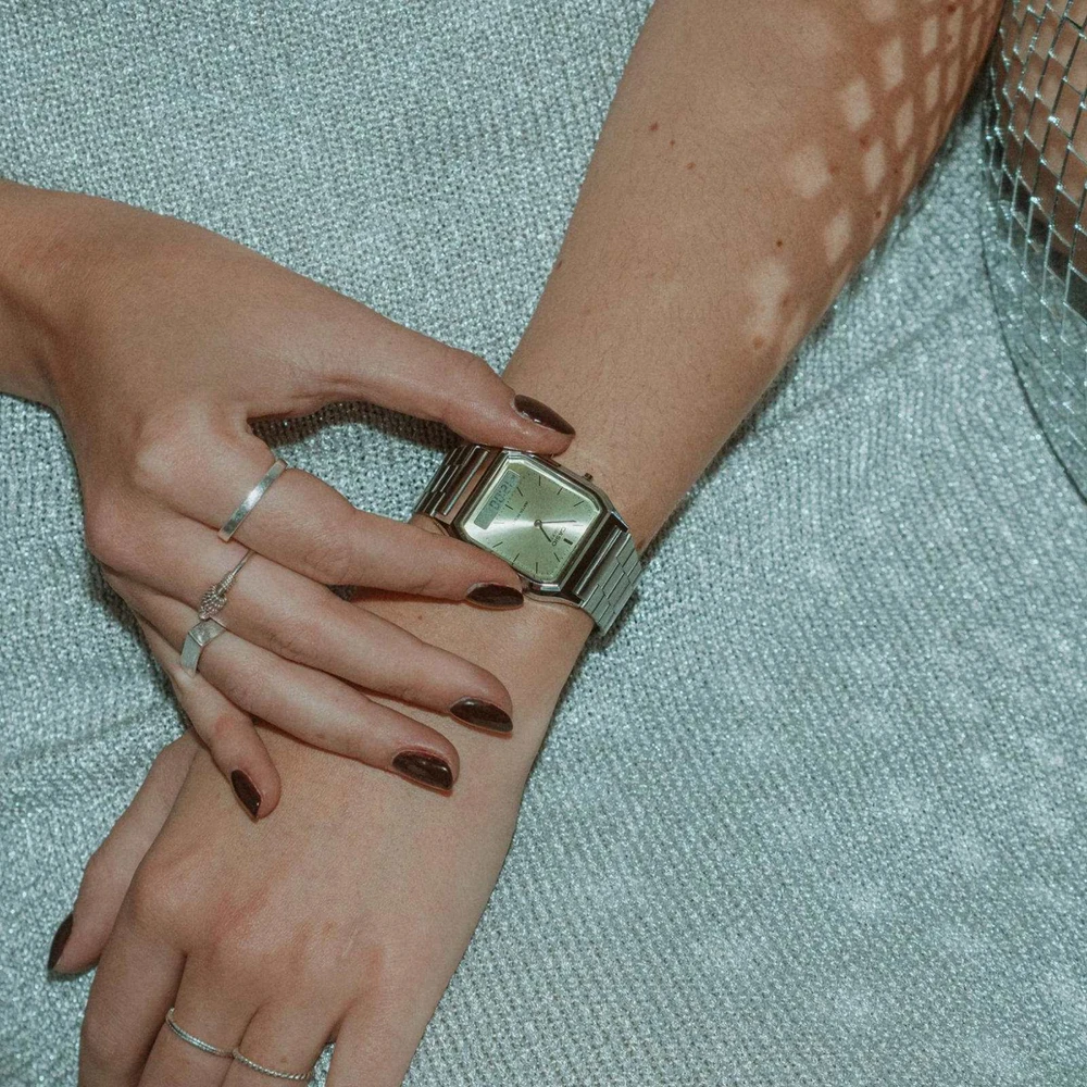 A combinação analógica-digital clássica ornamentada com tonalidades deslumbrantes. Com um mostrador Sunray para um toque colorido e elegante num design moderno. Resistência à água para utilização diária e funcionalidades práticas como cronómetro, alarme e muito mais.