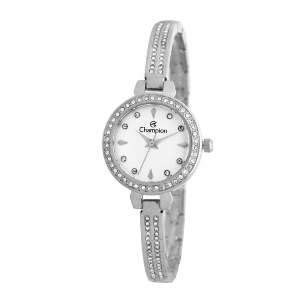 Caixa Em MetalPulseira Em Metal Estilo BraceleteVidro de Cristal MineralFundo RosqueadoResistente à Água 5 AtmDiâmetro / Largura da Caixa: 25.00 MMFunções: AnalógicoMostrador Prateado com pedrasAro externo de pedrasAlimentação do Maquinário: BateriaGarantia de 1 Ano