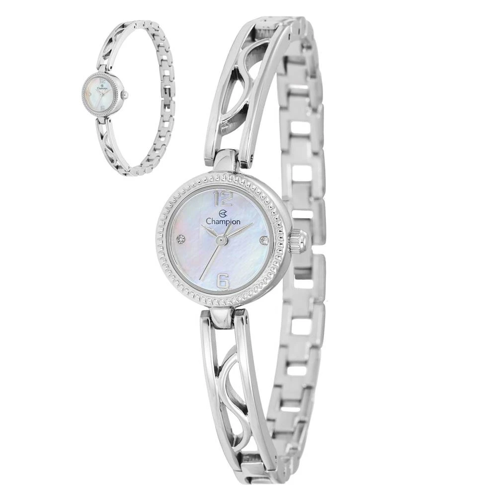 Caixa Em MetalPulseira Em Metal Estilo BraceleteVidro de Cristal MineralFundo de PressãoResistente à Água 3 AtmDiâmetro / Largura da Caixa: 19.00 MMFunções: AnalógicoMostrador Estilo Madreperola Branca com números e pedrasAlimentação do Maquinário: BateriaGarantia de 1 Ano