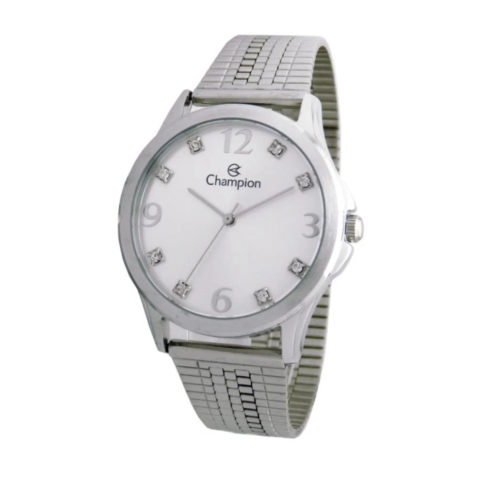 Caixa Em MetalPulseira Em AçoVidro de Cristal MineralFundo RosqueadoResistente à Água 5 AtmDiâmetro / Largura da Caixa: 38.00 MMFunções: AnalógicoMostrador Prateado com números e pedrasAlimentação do Maquinário: BateriaGarantia de 1 Ano