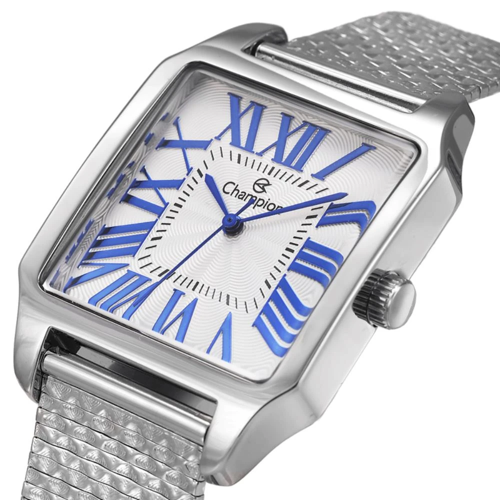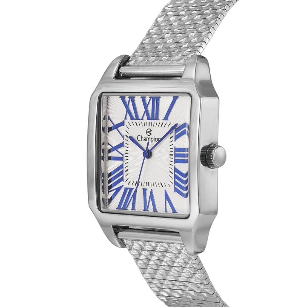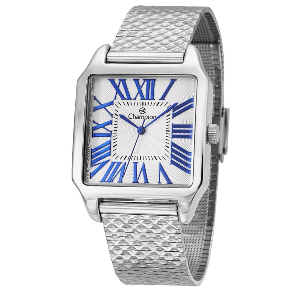 Caixa Em MetalPulseira Em AçoVidro de Cristal MineralFundo de PressãoResistente à Água 3 AtmDiâmetro / Largura da Caixa: 34.00 MM x 34.00 MMFunções: AnalógicoMostrador Prateado com Algarismos Romanos em azul