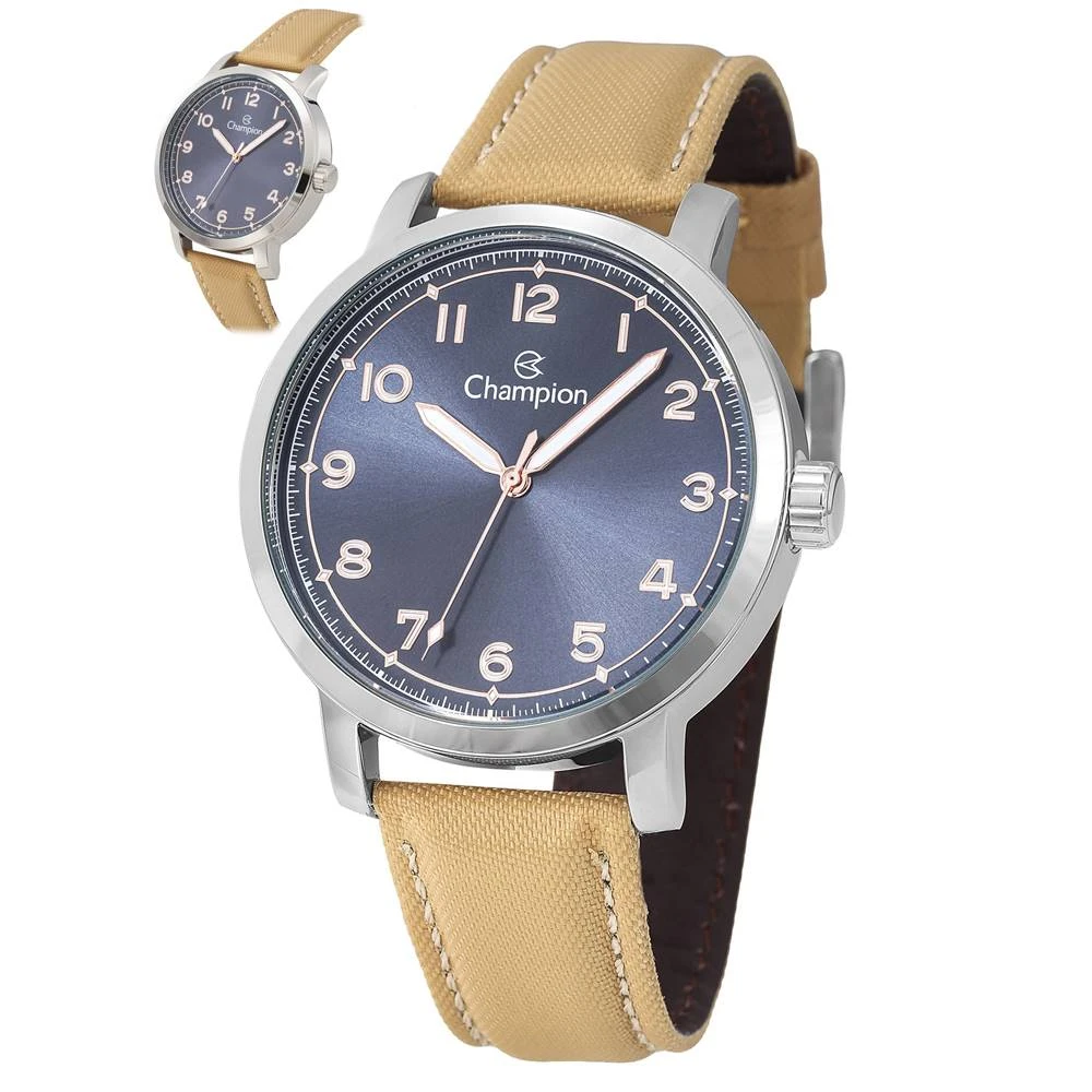 Caixa Em MetalPulseira Em Couro Legítimo revestido de tecido carameloVidro de Cristal MineralFundo de PressãoResistente à Água 5 AtmDiâmetro / Largura da Caixa: 43.00 MMFunções: AnalógicoMostrador Azul com todos os númerosAlimentação do maquinário: BateriaGarantia de 1 Ano