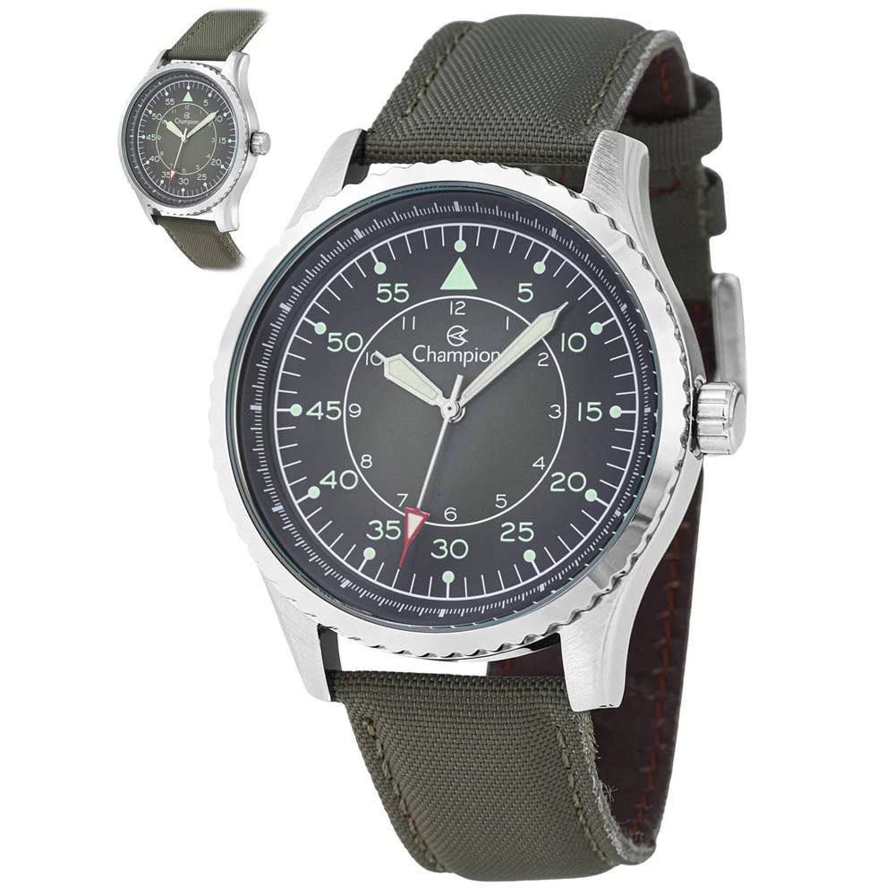 Caixa Em MetalPulseira Em Couro Legítimo revestido de tecido verdeVidro de Cristal MineralFundo de PressãoResistente à Água 5 AtmDiâmetro / Largura da Caixa: 44.00 MMFunções: AnalógicoMostrador Preto Degrade com númerosAlimentação do maquinário: BateriaGarantia de 1 Ano